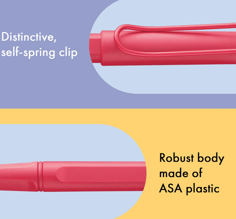 Füller, Ikone, Welterfolg: Der LAMY safari ist seit seiner Einführung in den 1980er Jahren ein geliebter Klassiker und erfreut sich eines für ein Schreibgerät untypischen Kultstatus. Unzählige Farben und immer wieder neu erscheinende Sondereditionen lassen die Herzen höher schlagen – egal, ob für die Federtasche oder die sorgsam kuratierte Füllersammlung. Der LAMY safari ist mehr als die Summe seiner Details: Er ist ästhetisch, robust und individuell. Der markante, selbstfedernde Clip hält das Schreibgerät sicher an Ort und Stelle befestigt. Das Gehäuse aus schlagzähem Kunststoff macht ihn zum robusten Begleiter in jedem Umfeld und die abgeflachte Form verhindert versehentliches Wegrollen. Funktionale Details wie subtil ergonomisch geformte Griffflächen und ein Sichtfenster zur Kontrolle des Tintenstands fügen sich wie selbstverständlich in das Design ein und machen den LAMY safari zum modernen Klassiker. Alltagstauglicher Tintenroller mit ergonomischem Griffstück. Markanter Clip aus Metall und widerstandsfähiges Gehäuse aus hochwertigem ASA-Kunststoff. Inklusive Tintenrollermine LAMY M 63 in Strichbreite M