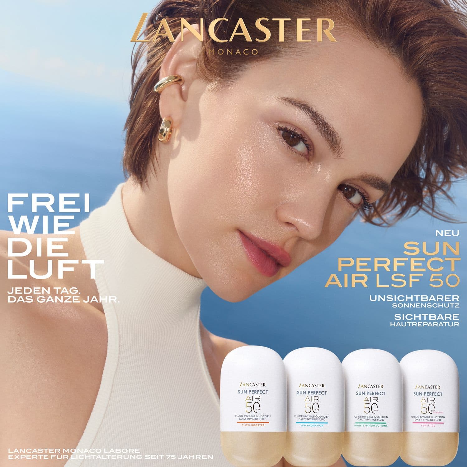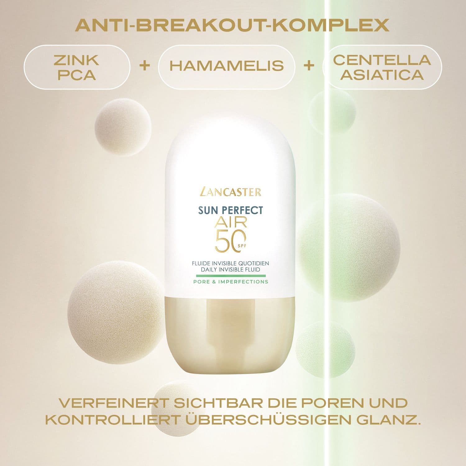 UNSICHTBARER SONNENSCHUTZ. SICHTBARE HAUTREPARATUR. Mit einer bahnbrechenden Formulierung, die unsichtbaren Sonnenschutz und zielgerichtete Korrektur bei Hautproblemen mithilfe dermatologischer Wirkstoffe kombiniert, definiert Lancaster Sun Perfect AIR Daily Invisible Fluid SPF 50 Pore & Imperfections UV-Schutz für jeden Tag neu. Dieses speziell für fettige Haut mit Neigung zu Unreinheiten formulierte Lancaster Sonnenschutz-Fluid vereint leistungsstarken Schutz für jeden Tag mit einer mattierenden Wirkung. Die ultraleichte Textur bietet ein atmungsaktives, schwereloses, unsichtbares Finish - ganz ohne Beschweren oder weiße Rückstände. Unterstützt durch eine exklusive Zweifach-Technologie: