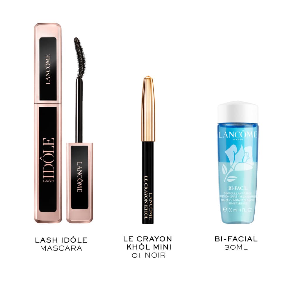 | Anwendungshinweis | Lash Idôle Mascara mit dem geschwungenen Bürstchen in Aufwärtsbewegungen auf die oberen Wimpern und in Abwärtsbewegungen auf die unteren Wimpern auftragen, um ein volles, aufgefächertes Volumen zu erzielen. Augen mit dem Le Crayon Khôl für sanfte, präzise Farbe definieren. Make-up mit dem Bi-Facil Augen-Make-up-Entferner Make-up einfach entfernen, für gereinigte Wimpern und erfrischte Haut. |