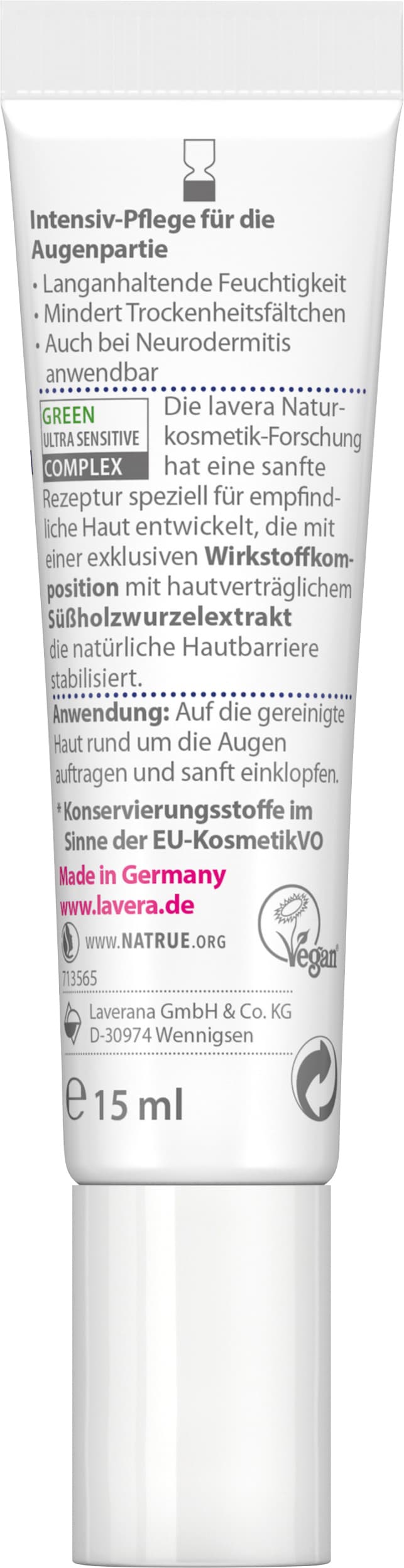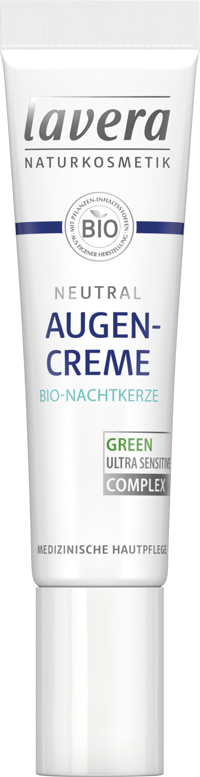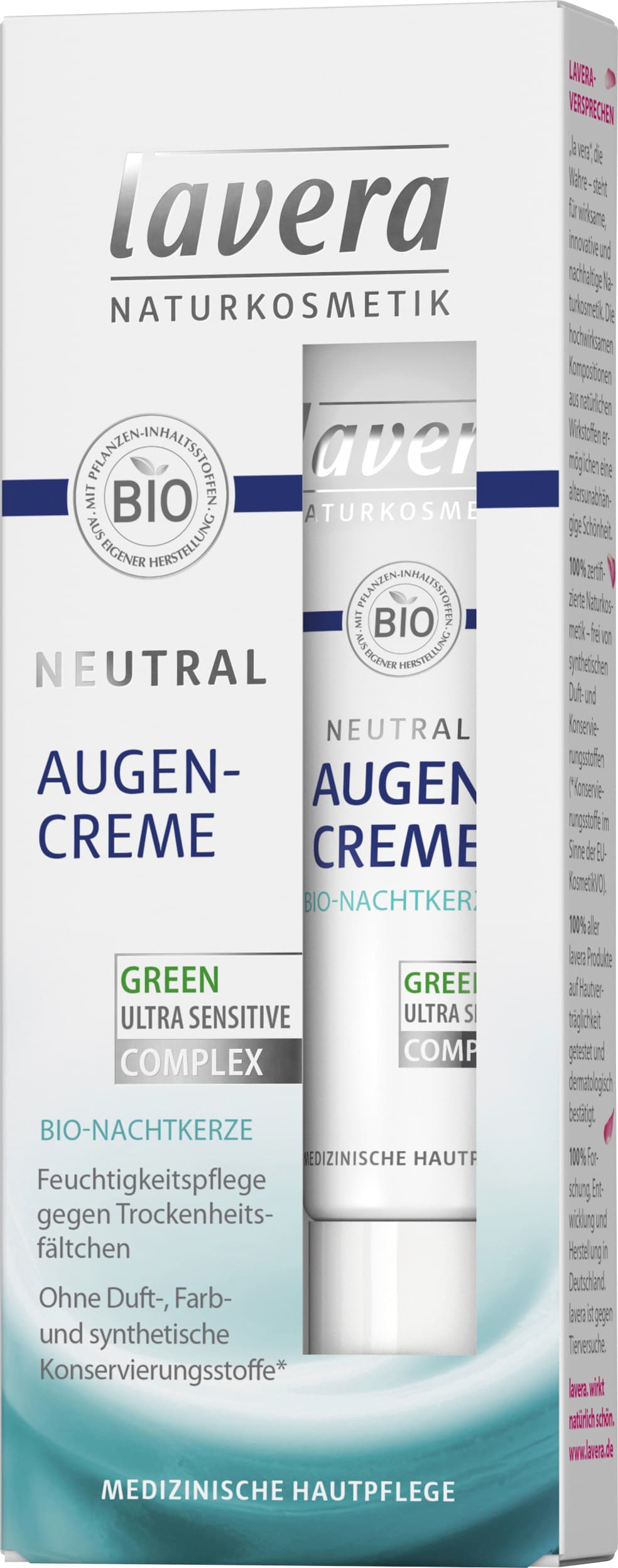 Die Augenpartie ist von Natur aus zart besaitet – insbesondere bei empfindlicher, zu Allergien neigender Haut. Unsere lavera NEUTRAL Augencreme mit Bio-Nachtkerze verwöhnt deine empfindliche Haut mit einer geschmeidigen, cremig leichten Textur. Sie spendet intensive und langanhaltende Feuchtigkeit und beruhigt die sensible Augenpartie. Darüber hinaus mindert die hochwirksame Rezeptur Trockenheitsfältchen und dank hautverträglicher Süßholzwurzelextrakte wird die Hautbarriere stabilisiert.Deine Extra-Pflege für schutzbedürftige Haut!Die lavera NEUTRAL Augencreme ist vegan und verzichtet deiner empfindlichen Haut zuliebe auf Farb-, Duft- und synthetische Konservierungsstoffe (gem. EU-Kosmetik-VO).- Bio-Nachtkerze: Nachtkerzenöl besitzt heilungsfördernde und hautberuhigende Eigenschaften und kommt besonders der empfindlichen und sehr trockenen Haut zugute.GREEN ULTRA SENSITIVE COMPLEX:Die lavera Naturkosmetik-Forschung hat eine sanfte Rezeptur speziell für empfindliche Haut entwickelt, die mit einer exklusiven Wirkstoffkomposition mit hautverträglichem Süßholzwurzelextrakt die natürliche Hautbarriere stabilisiert.Unser Versprechen:- Zertifiziert nach dem strengen, unabhängigen NATRUE Naturkosmetikstandard. Verträglichkeit dermatologisch bestätigt- Nach PETA Kriterien zertifiziert und für das Tierwohl engagiert- Exklusive Naturkompositionen aus der lavera-Forschung, mit dem Besten aus der Natur- In Deutschland hergestellt