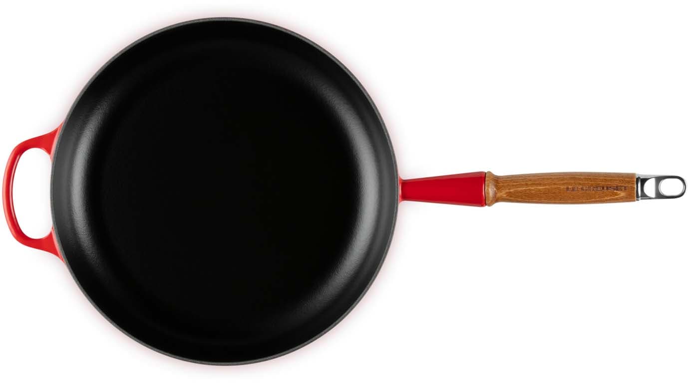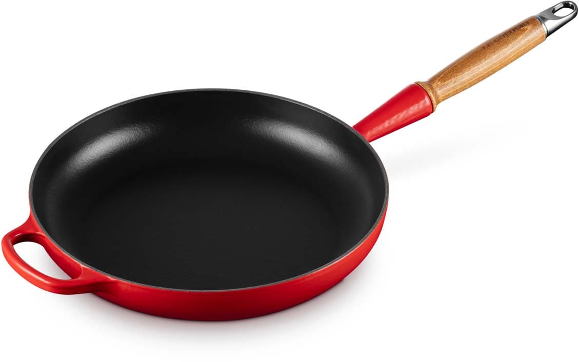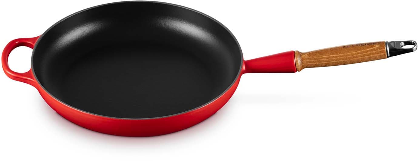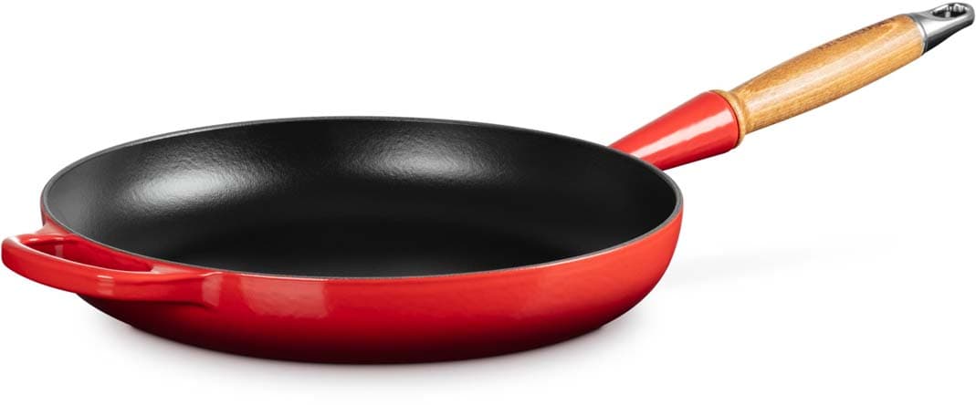 Die Bratpfanne verfügt über einen ergonomischen Holzgriff, der ein sicheres und komfortables Handling ermöglicht. Die robuste und langlebige Emaillierung sorgt für eine einfache Reinigung und schützt das Gusseisen vor Abnutzung. Das Material gewährleistet eine gleichmäßige Wärmeverteilung, sodass Speisen optimal gegart werden. Die farbenfrohe Emaillierung ergänzt jeden Küchenstil und macht die Bratpfanne zu einem echten Blickfang.