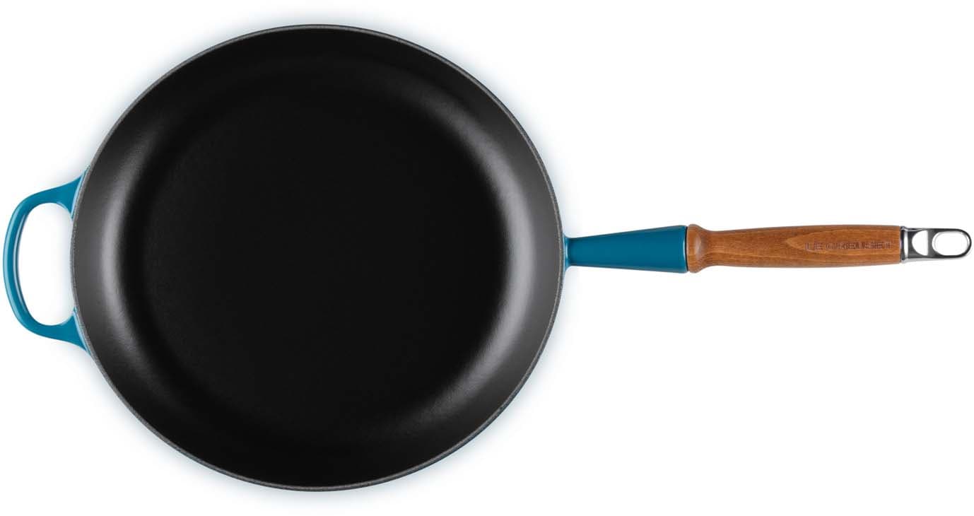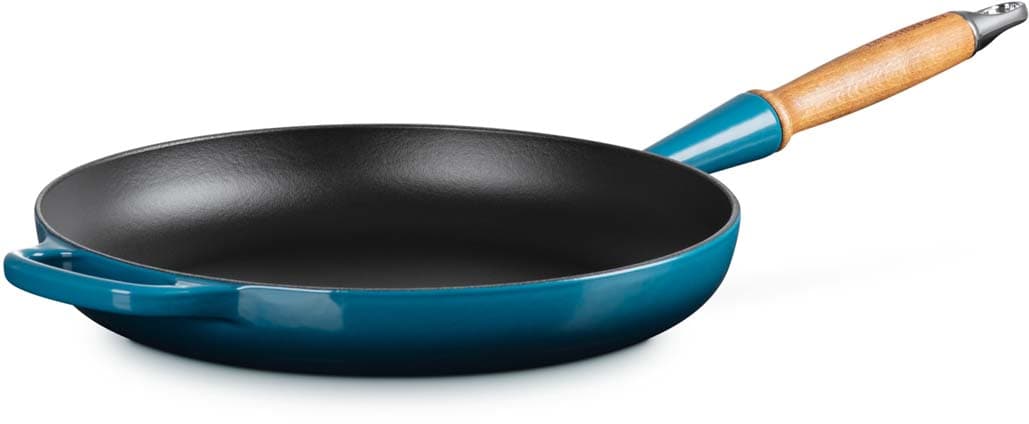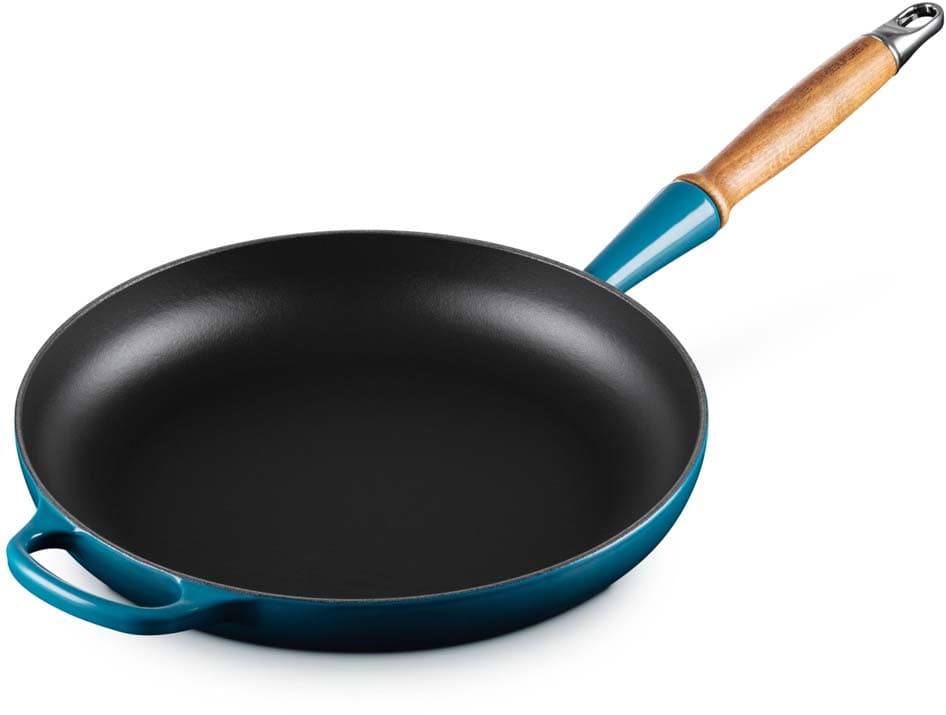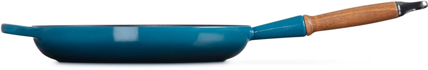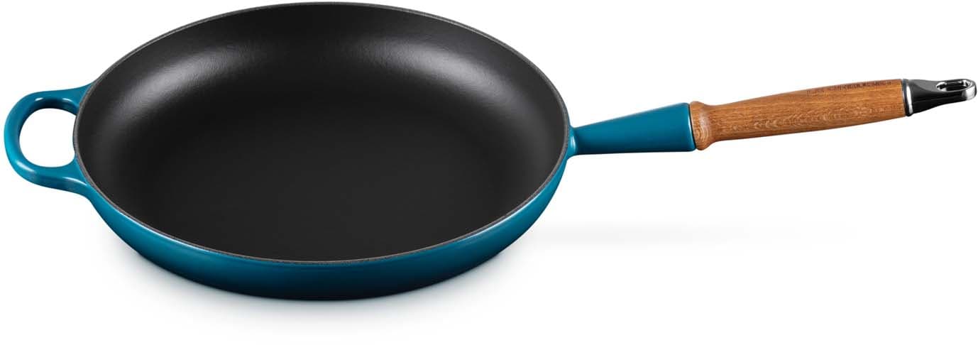 Die Bratpfanne verfügt über einen ergonomischen Holzgriff, der ein sicheres und komfortables Handling ermöglicht. Die robuste und langlebige Emaillierung sorgt für eine einfache Reinigung und schützt das Gusseisen vor Abnutzung. Das Material gewährleistet eine gleichmäßige Wärmeverteilung, sodass Speisen optimal gegart werden. Die farbenfrohe Emaillierung ergänzt jeden Küchenstil und macht die Bratpfanne zu einem echten Blickfang.
