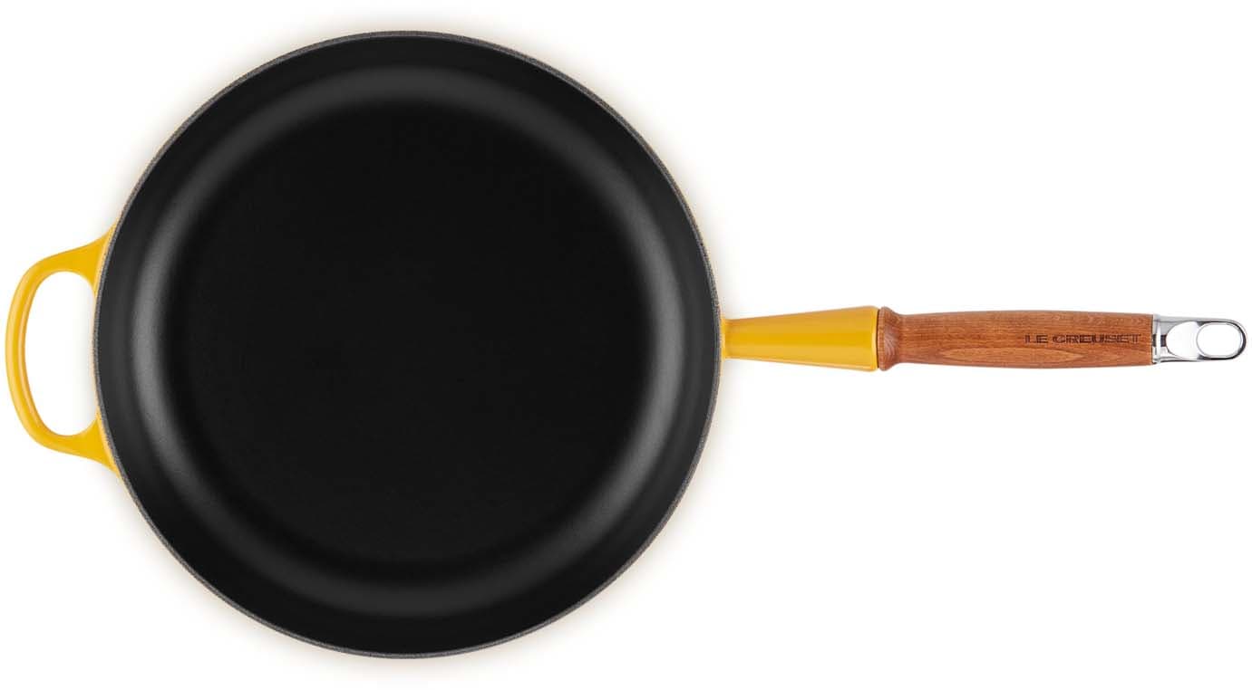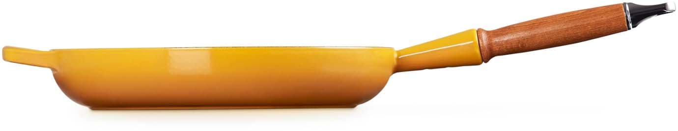Die Bratpfanne verfügt über einen ergonomischen Holzgriff, der ein sicheres und komfortables Handling ermöglicht. Die robuste und langlebige Emaillierung sorgt für eine einfache Reinigung und schützt das Gusseisen vor Abnutzung. Das Material gewährleistet eine gleichmäßige Wärmeverteilung, sodass Speisen optimal gegart werden. Die farbenfrohe Emaillierung ergänzt jeden Küchenstil und macht die Bratpfanne zu einem echten Blickfang.