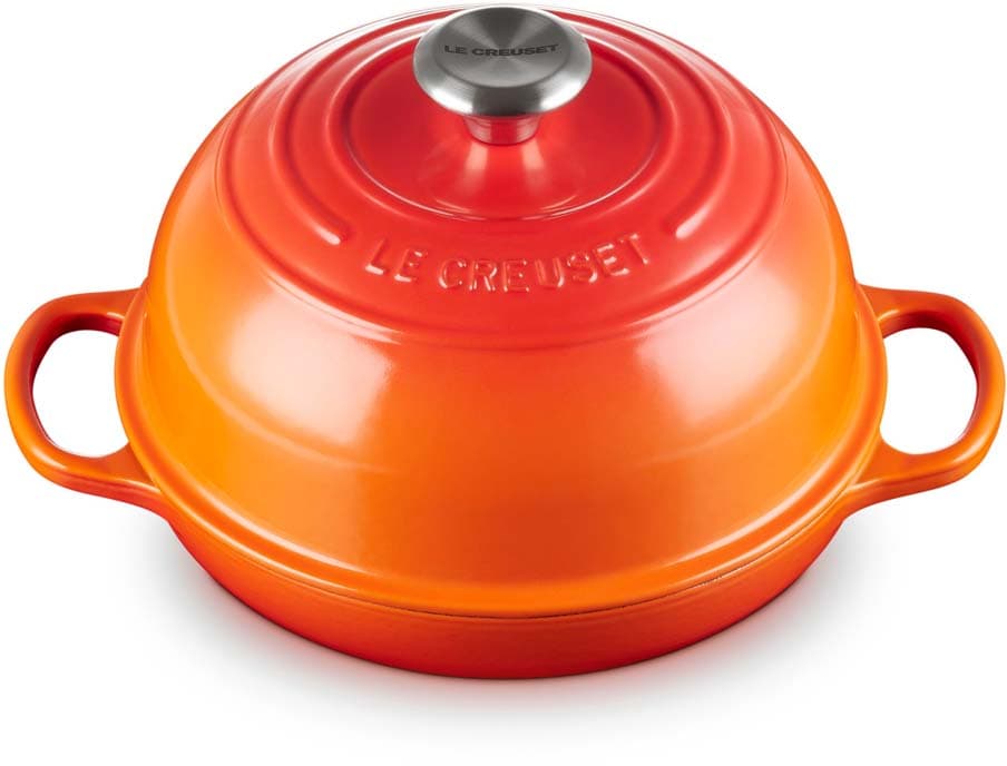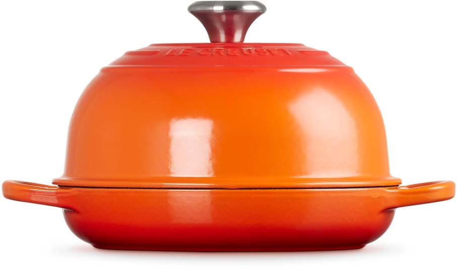 Zu den besonderen Vorzügen des Brot Bräters gehören handliche, großzügige Griffe, eine langlebige, mattschwarz emaillierte Innenseite, ein hitzebeständiger Deckelknopf aus Edelstahl und ein besonders dicht schließender Deckel. Gusseisen hält die Backwaren am Tisch länger warm, sodass der Bräter auch zum Servieren geeignet ist. Die farbenfrohe Emaillierung ergänzt jeden Küchenstil und macht den Brot Bräter zu einem echten Blickfang.