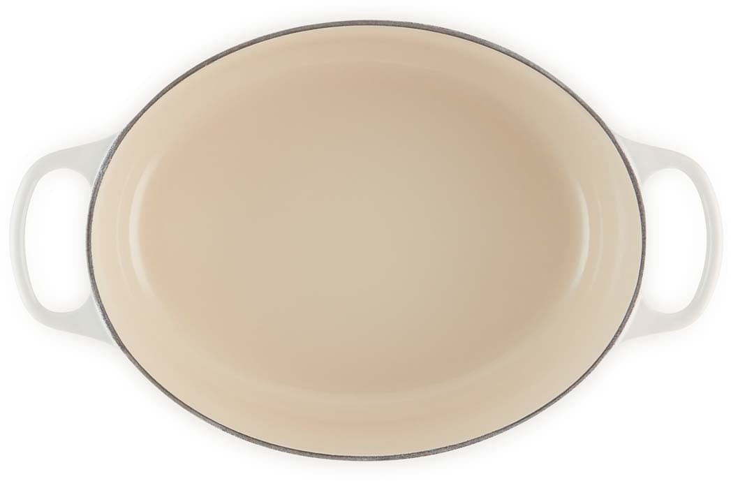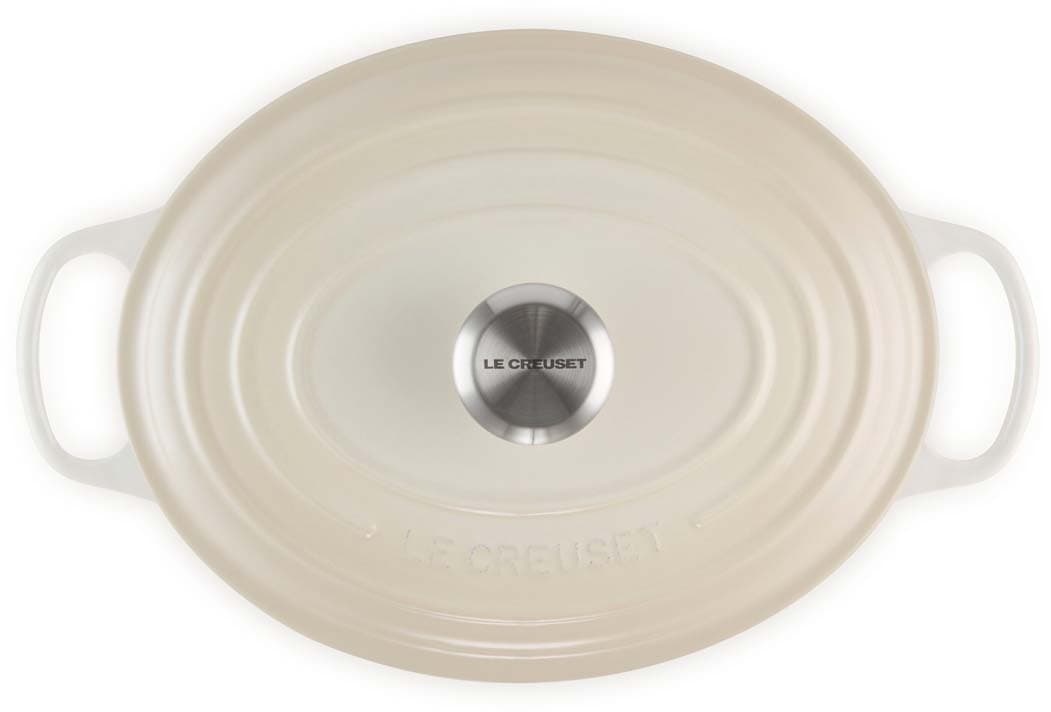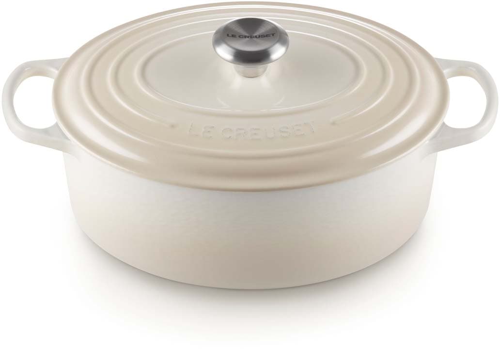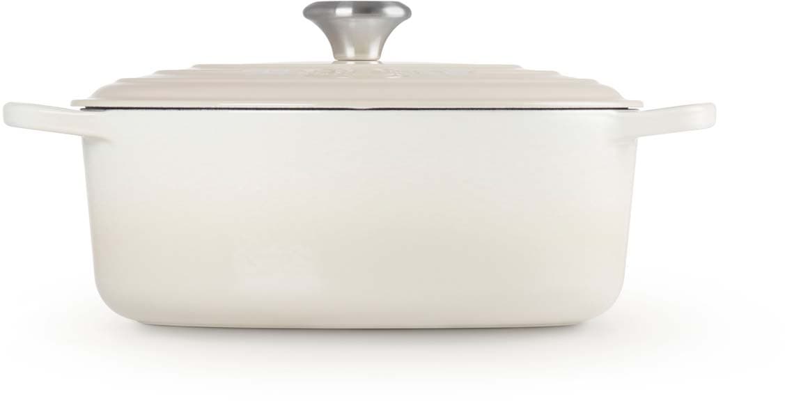 Der ovale gusseiserne Bräter Signature von Le Creuset mit 29 cm Durchmesser eignet sich ideal für größere Fleischstücke und ganze Braten. Versuchen Sie zum Beispiel, ein ganzes Hähnchen mit aufgesetztem Deckel zu garen – das Fleisch wird wunderbar saftig, fällt vom Knochen und der Ofen bleibt sauber. Der ovale Bräter ist genauso vielseitig wie sein rundes Pendant. Er bietet ausreichend Platz, um eine ganze Lammkeule zuzubereiten, und ist gleichzeitig schmal genug, um im Ofen zusätzlichen Raum für Beilagen zu lassen.