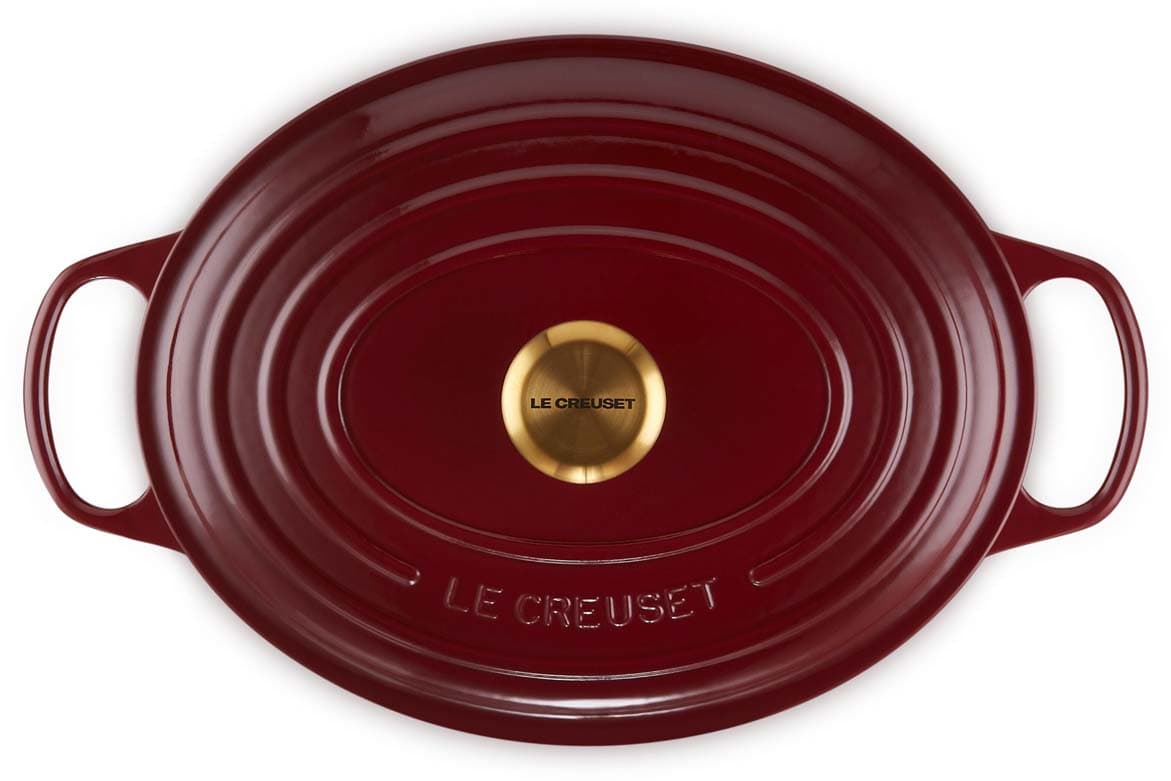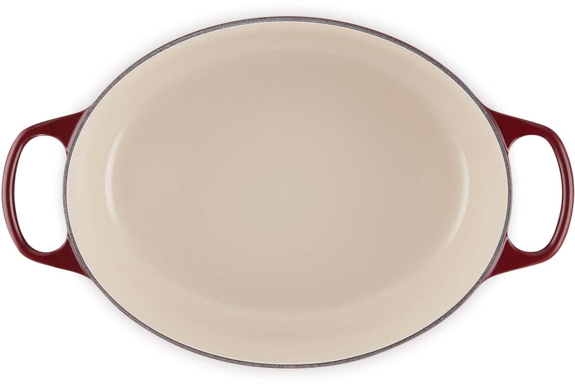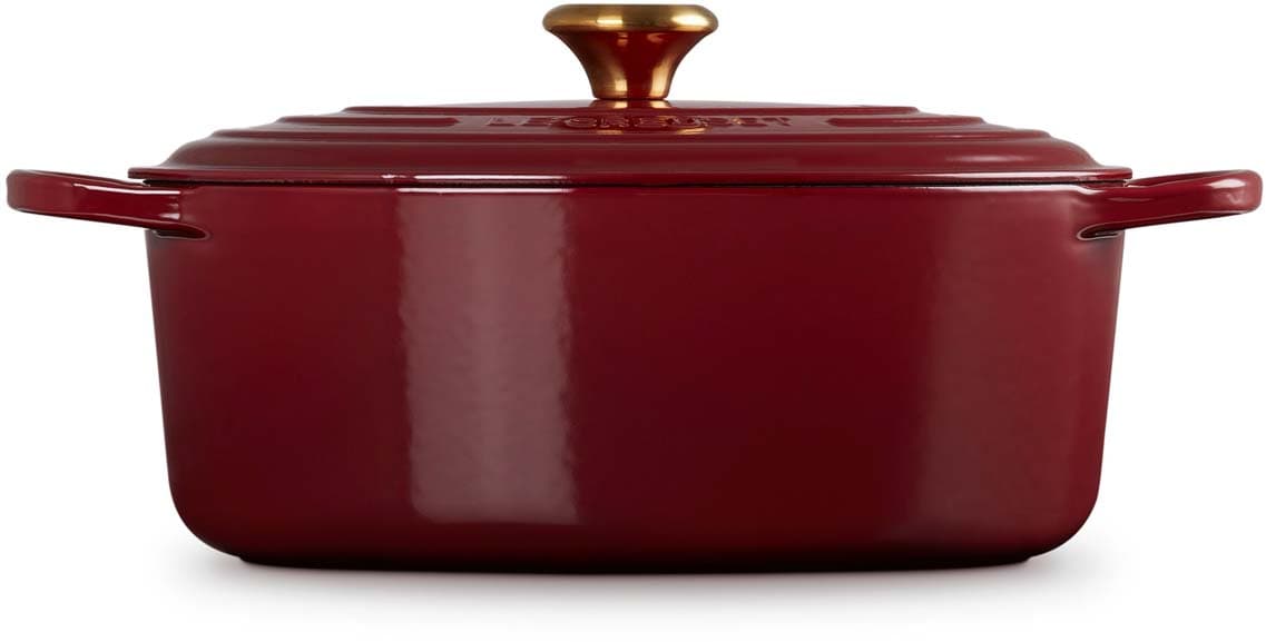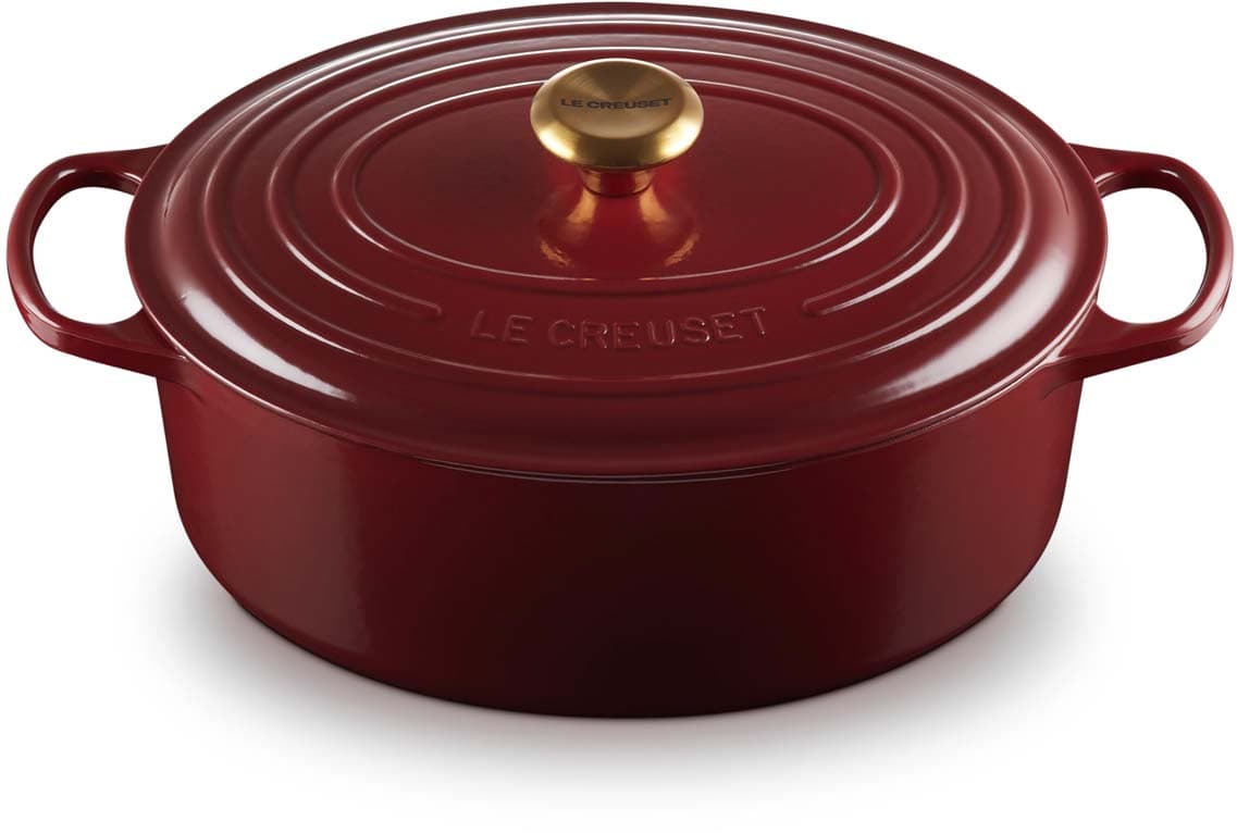 Der ovale gusseiserne Bräter Signature von Le Creuset mit 31 cm Durchmesser eignet sich ideal für größere Fleischstücke und ganze Braten. Versuchen Sie zum Beispiel, ein ganzes Hähnchen mit aufgesetztem Deckel zu garen – das Fleisch wird wunderbar saftig, fällt vom Knochen und der Ofen bleibt sauber. Der ovale Bräter ist genauso vielseitig wie sein rundes Pendant. Er bietet ausreichend Platz, um eine ganze Lammkeule zuzubereiten, und ist gleichzeitig schmal genug, um im Ofen zusätzlichen Raum für Beilagen zu lassen.