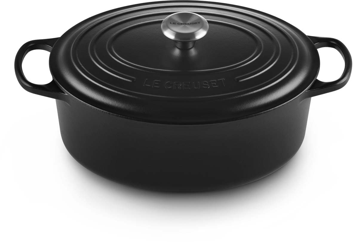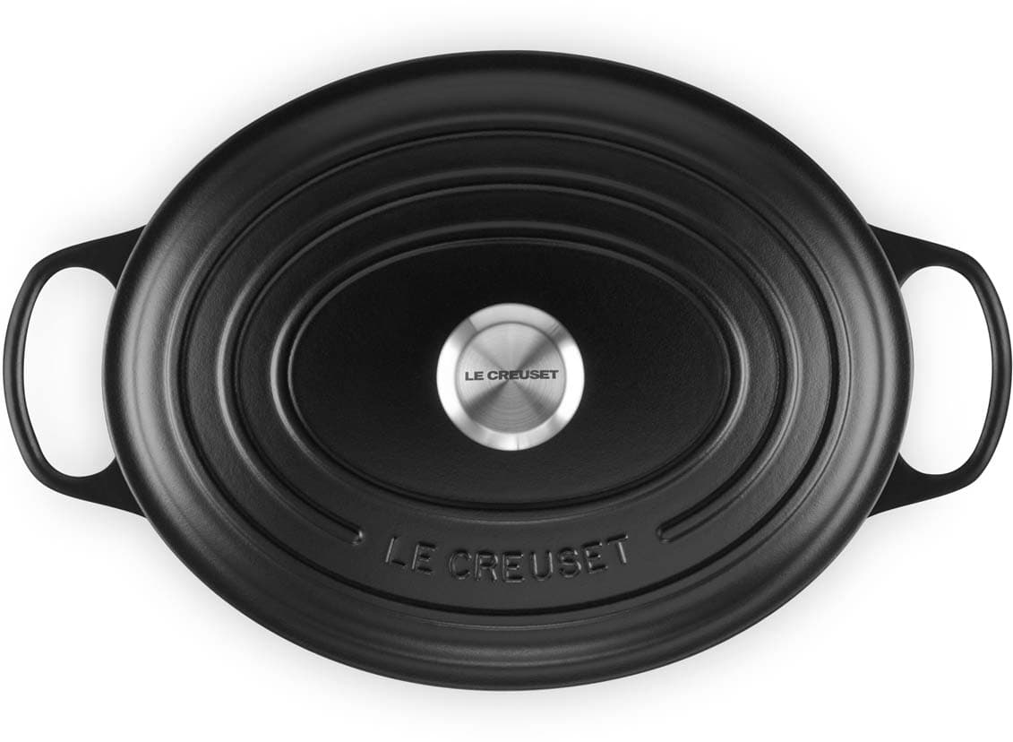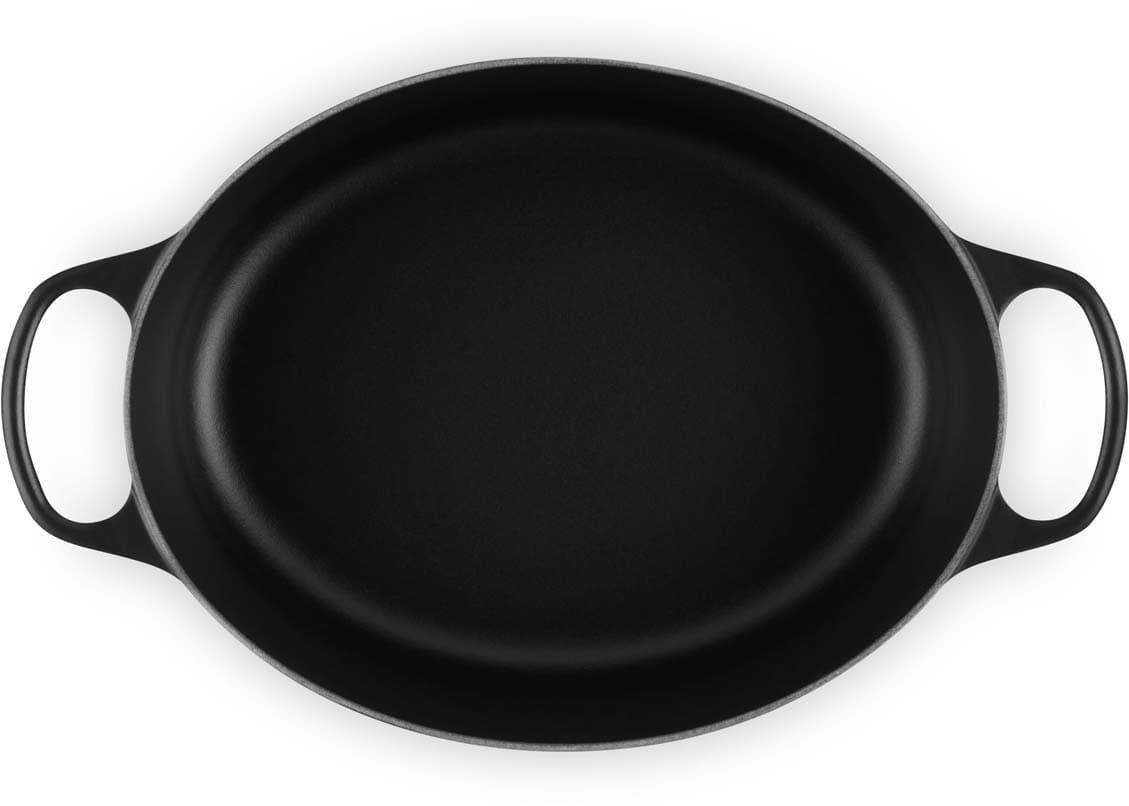 Der ovale gusseiserne Bräter Signature von Le Creuset mit 31 cm Durchmesser eignet sich ideal für größere Fleischstücke und ganze Braten. Versuchen Sie zum Beispiel, ein ganzes Hähnchen mit aufgesetztem Deckel zu garen – das Fleisch wird wunderbar saftig, fällt vom Knochen und der Ofen bleibt sauber. Der ovale Bräter ist genauso vielseitig wie sein rundes Pendant. Er bietet ausreichend Platz, um eine ganze Lammkeule zuzubereiten, und ist gleichzeitig schmal genug, um im Ofen zusätzlichen Raum für Beilagen zu lassen.