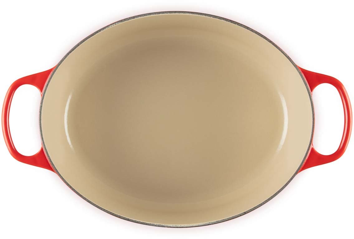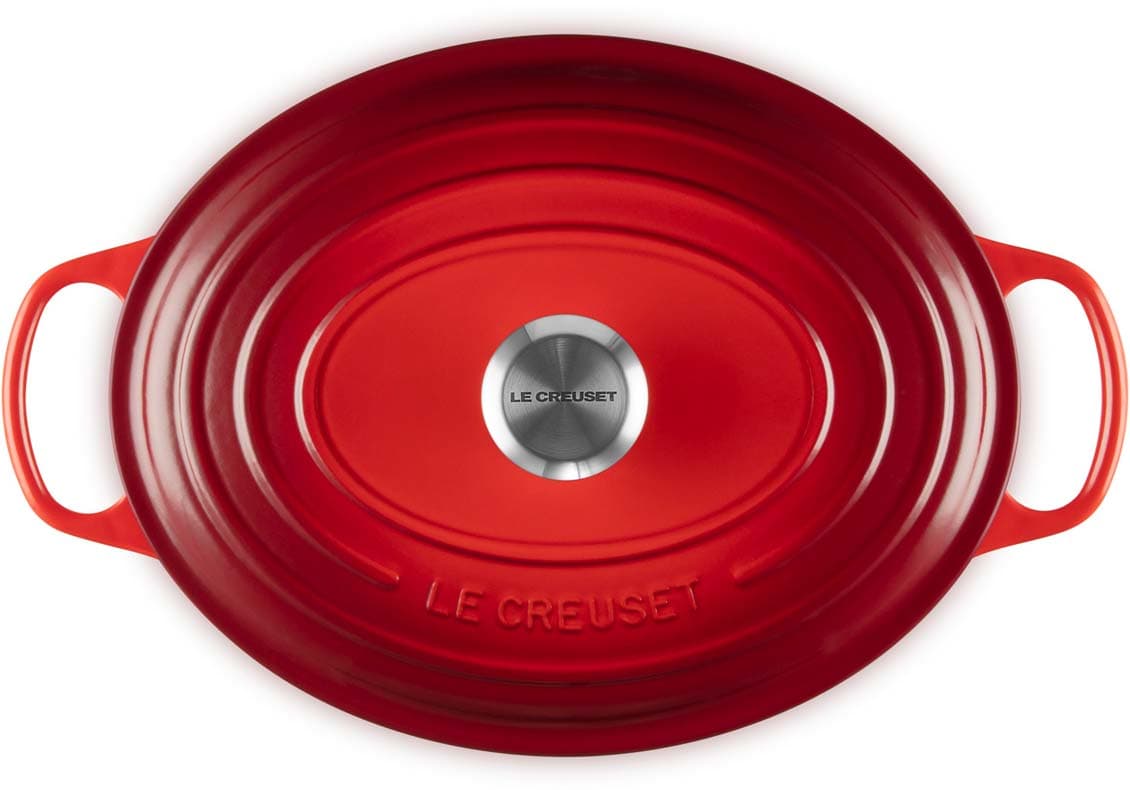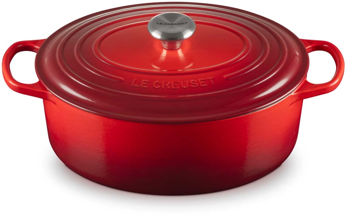 Der ovale gusseiserne Bräter Signature von Le Creuset mit 31 cm Durchmesser eignet sich ideal für größere Fleischstücke und ganze Braten. Versuchen Sie zum Beispiel, ein ganzes Hähnchen mit aufgesetztem Deckel zu garen – das Fleisch wird wunderbar saftig, fällt vom Knochen und der Ofen bleibt sauber. Der ovale Bräter ist genauso vielseitig wie sein rundes Pendant. Er bietet ausreichend Platz, um eine ganze Lammkeule zuzubereiten, und ist gleichzeitig schmal genug, um im Ofen zusätzlichen Raum für Beilagen zu lassen.
