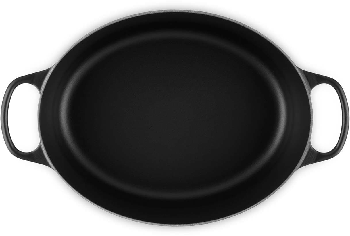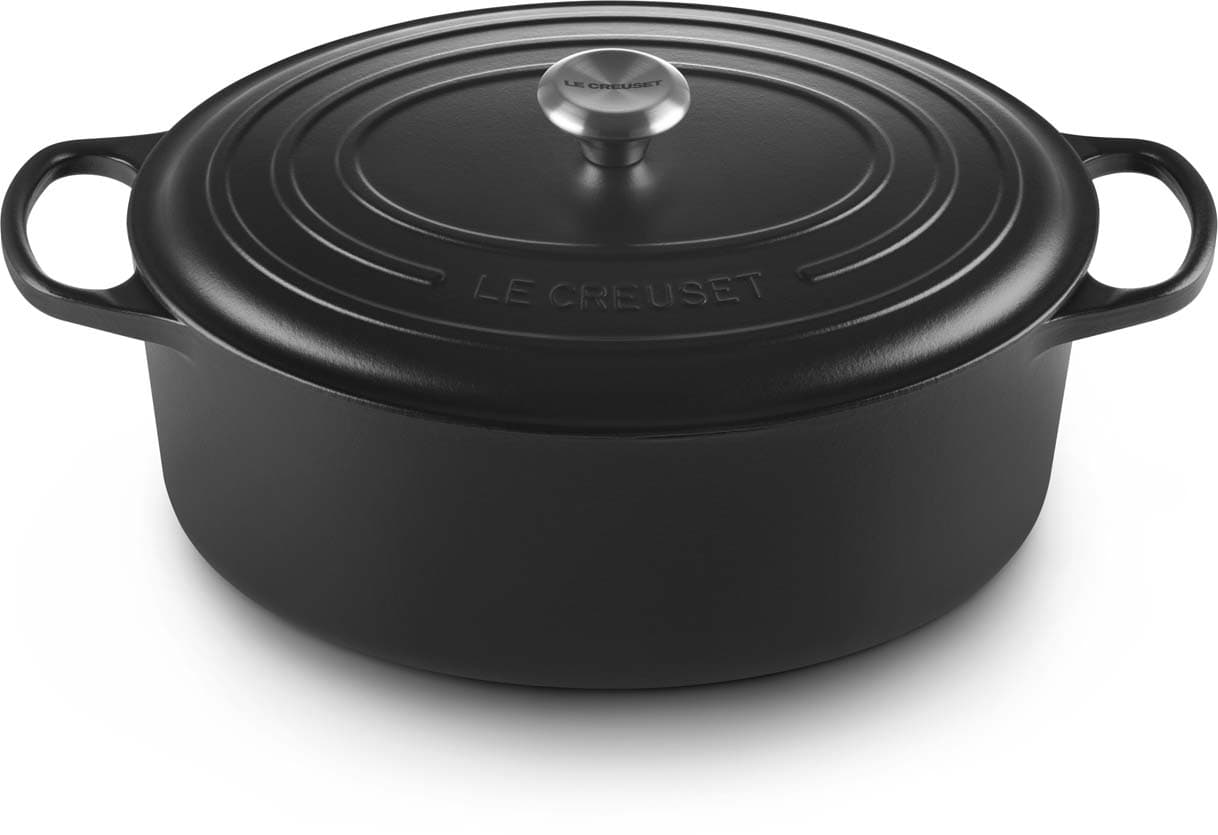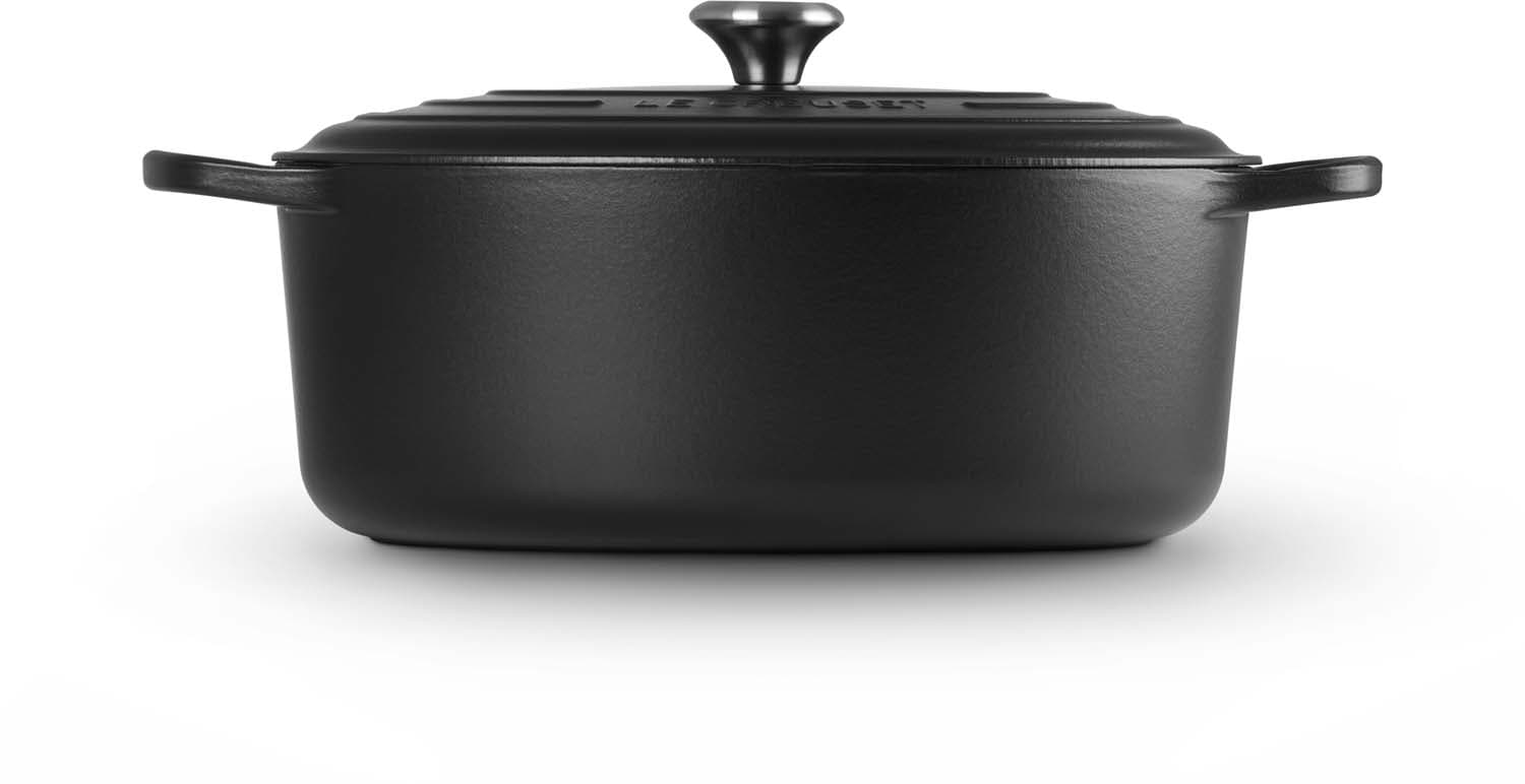 Der ovale gusseiserne Bräter Signature von Le Creuset mit 35 cm Durchmesser eignet sich ideal für größere Fleischstücke und ganze Braten. Versuchen Sie zum Beispiel, ein ganzes Hähnchen mit aufgesetztem Deckel zu garen – das Fleisch wird wunderbar saftig, fällt vom Knochen und der Ofen bleibt sauber. Der ovale Bräter ist genauso vielseitig wie sein rundes Pendant. Er bietet ausreichend Platz, um eine ganze Lammkeule zuzubereiten, und ist gleichzeitig schmal genug, um im Ofen zusätzlichen Raum für Beilagen zu lassen.