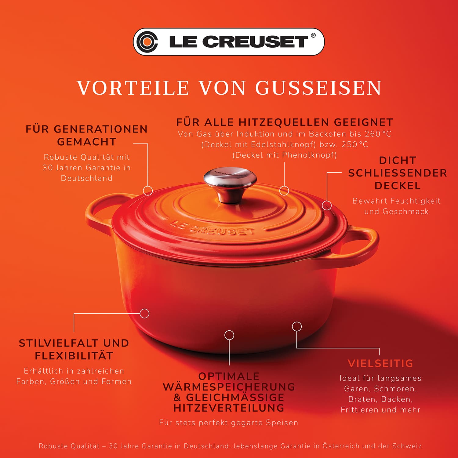 Jedes Produkt aus Gusseisen ist ein Unikat – seit 1925 handgefertigt in der Gießerei in Frankreich. Le Creuset gewährt in Deutschland auf das Gusseisensortiment eine Garantie von 30 Jahren. In Österreich und der Schweiz gilt darauf eine lebenslange Garantie.