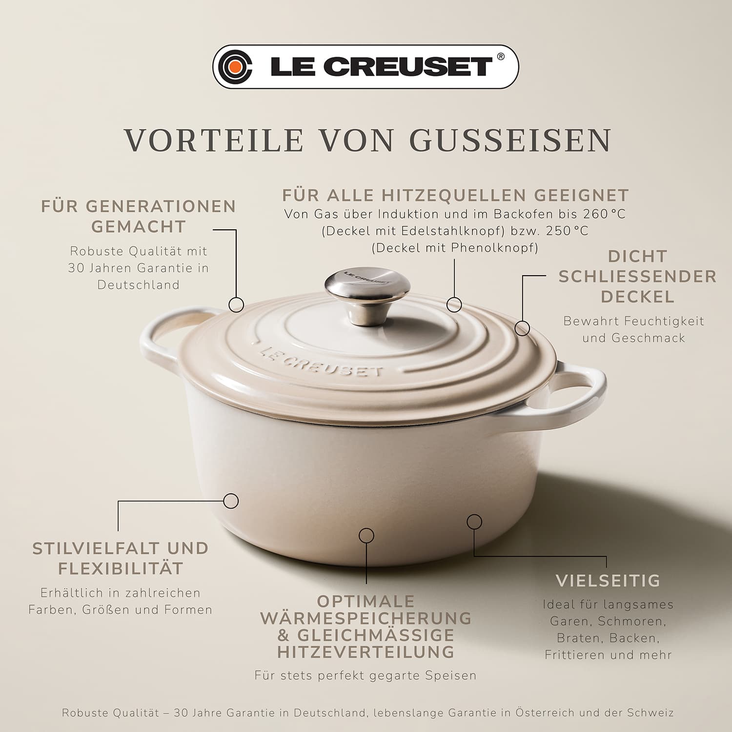 Jedes Produkt aus Gusseisen ist ein Unikat – seit 1925 handgefertigt in der Gießerei in Frankreich. Le Creuset gewährt in Deutschland auf das Gusseisensortiment eine Garantie von 30 Jahren. In Österreich und der Schweiz gilt darauf eine lebenslange Garantie.