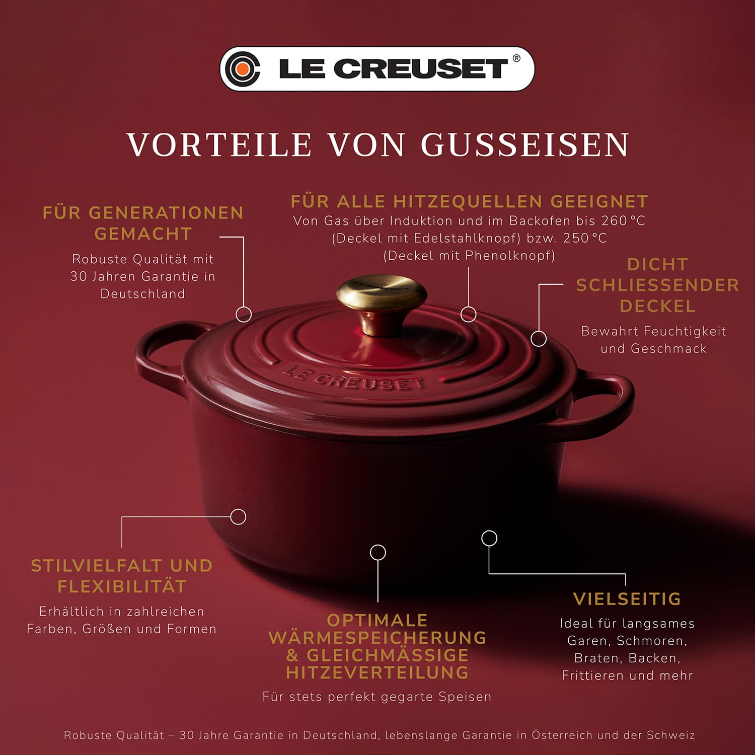 Jedes Produkt aus Gusseisen ist ein Unikat – seit 1925 handgefertigt in der Gießerei in Frankreich. Le Creuset gewährt in Deutschland auf das Gusseisensortiment eine Garantie von 30 Jahren. In Österreich und der Schweiz gilt darauf eine lebenslange Garantie.