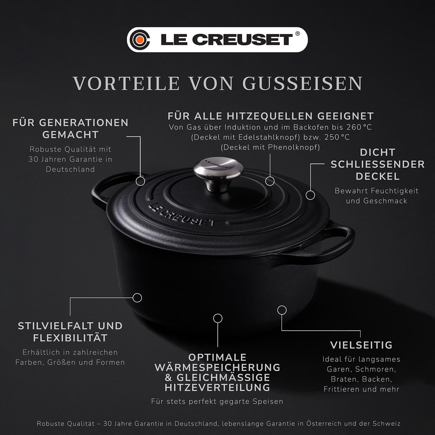 Jedes Produkt aus Gusseisen ist ein Unikat – seit 1925 handgefertigt in der Gießerei in Frankreich. Le Creuset gewährt in Deutschland auf das Gusseisensortiment eine Garantie von 30 Jahren. In Österreich und der Schweiz gilt darauf eine lebenslange Garantie.