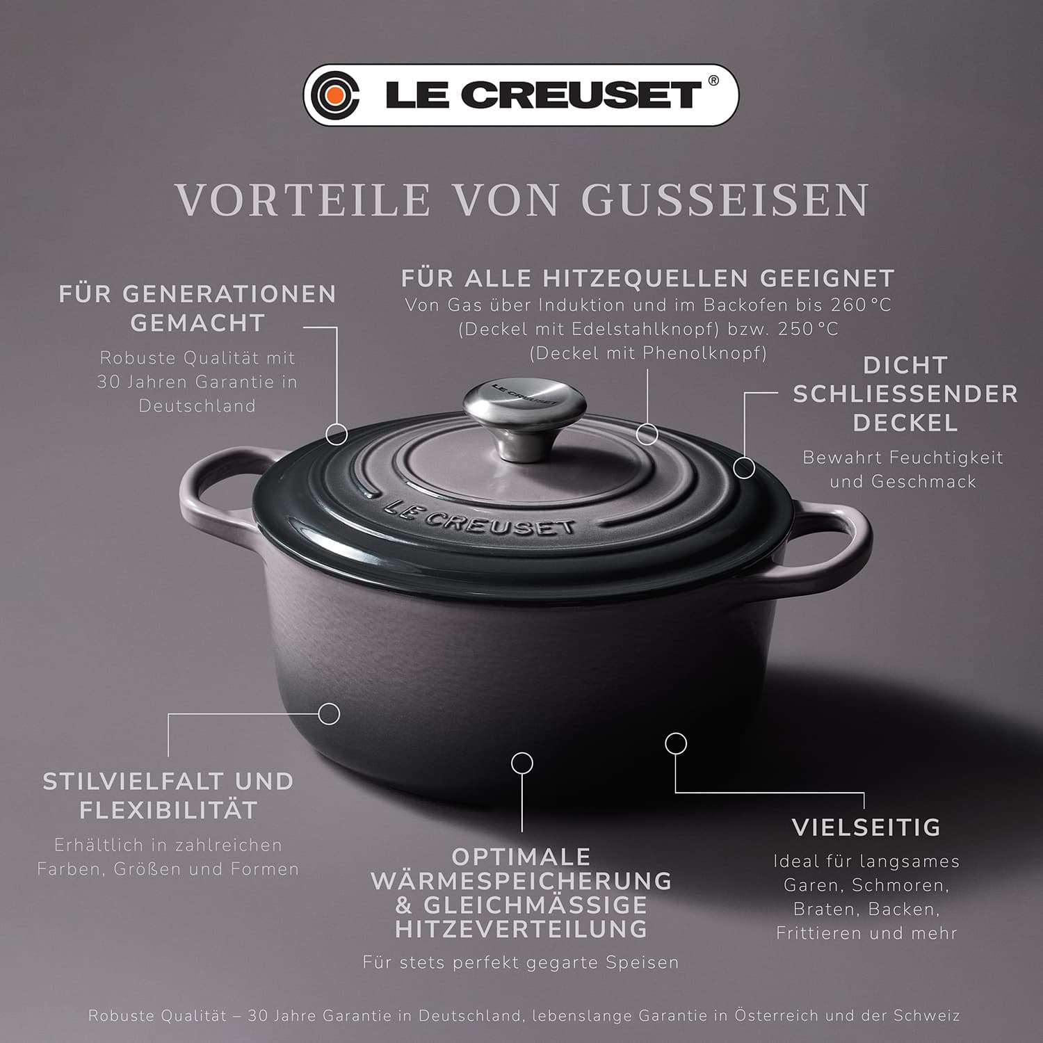 Jedes Produkt aus Gusseisen ist ein Unikat – seit 1925 handgefertigt in der Gießerei in Frankreich. Le Creuset gewährt in Deutschland auf das Gusseisensortiment eine Garantie von 30 Jahren. In Österreich und der Schweiz gilt darauf eine lebenslange Garantie.