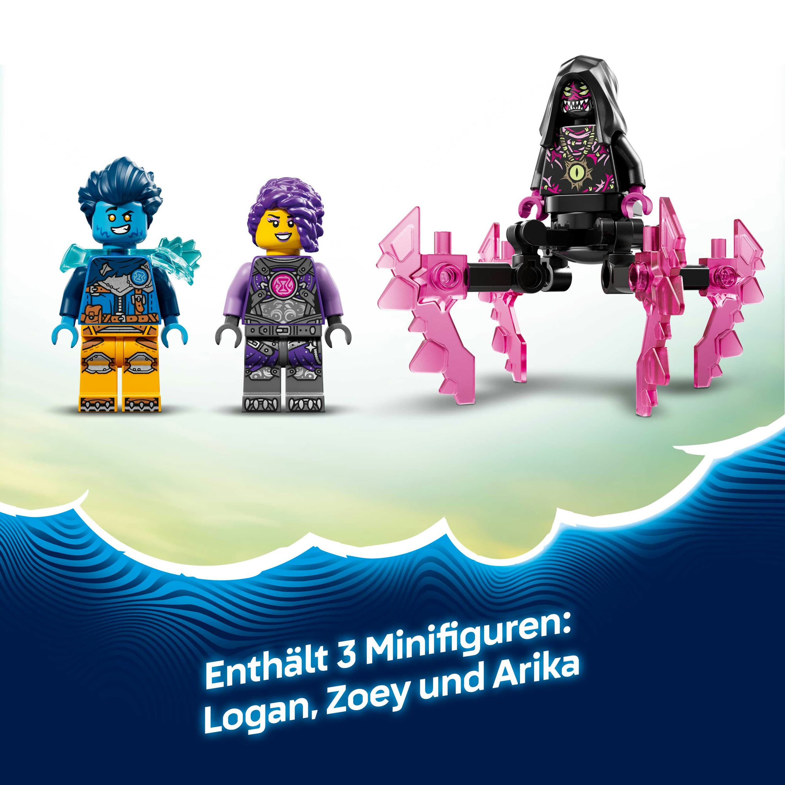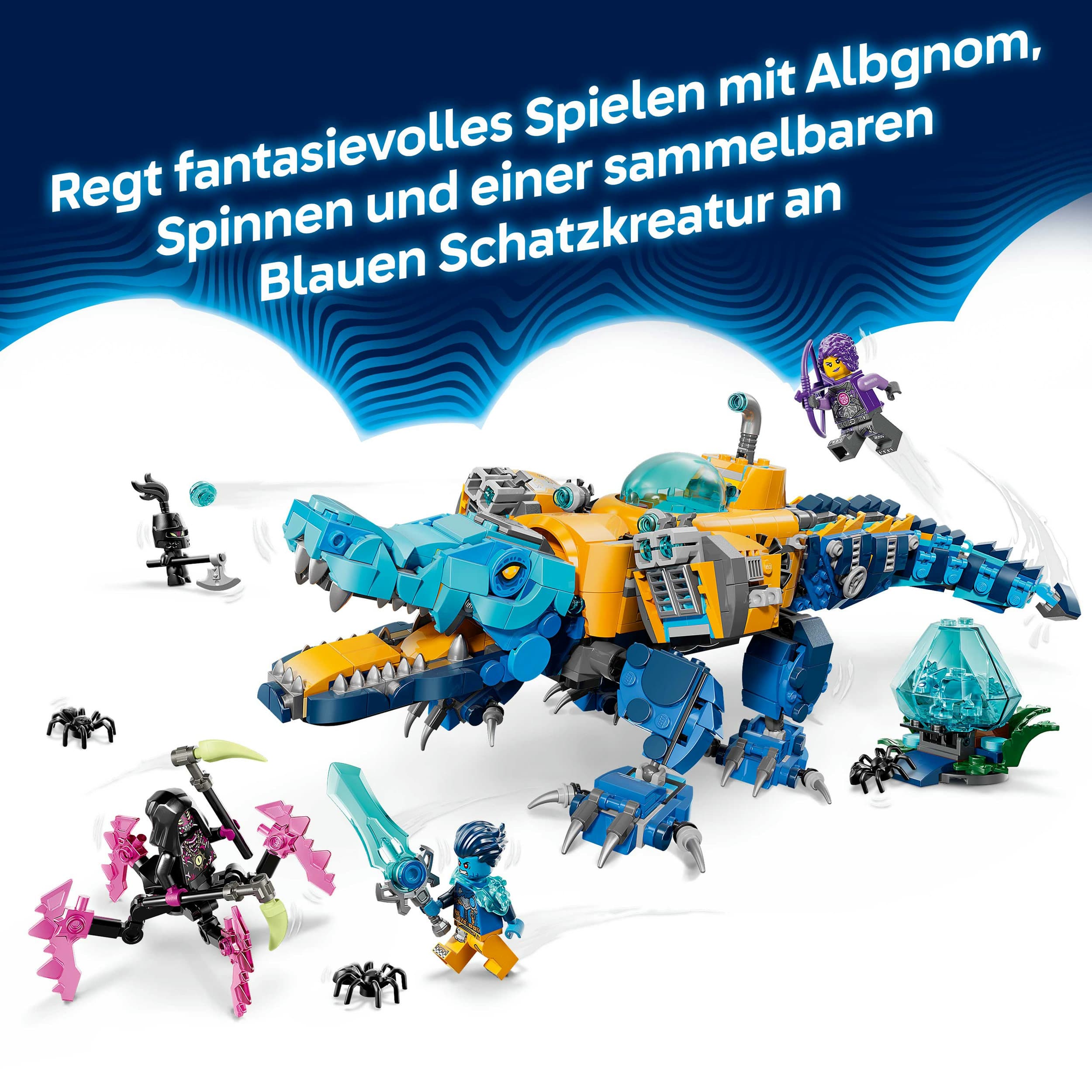 Das U-Boot hat zwei Shooter und ein Geheimfach sowie ein Cockpit, in das eine Minifigur passt. Das Krokodil kann Kopf, Beine und Schwanz bewegen, und der Adler hat bewegliche Flügel mit Federn, die an Boostern stecken. Neben den Minifiguren Logan, Zoey und Arika laden auch ein Albgnom, 2 Spinnen und eine Blaue Schatzkreatur zu fantasievollen Rollenspielen ein. Logan schwingt ein blaues Schwert zum Sammeln, Zoey trägt einen Bogen und Arika hat eine Sense.