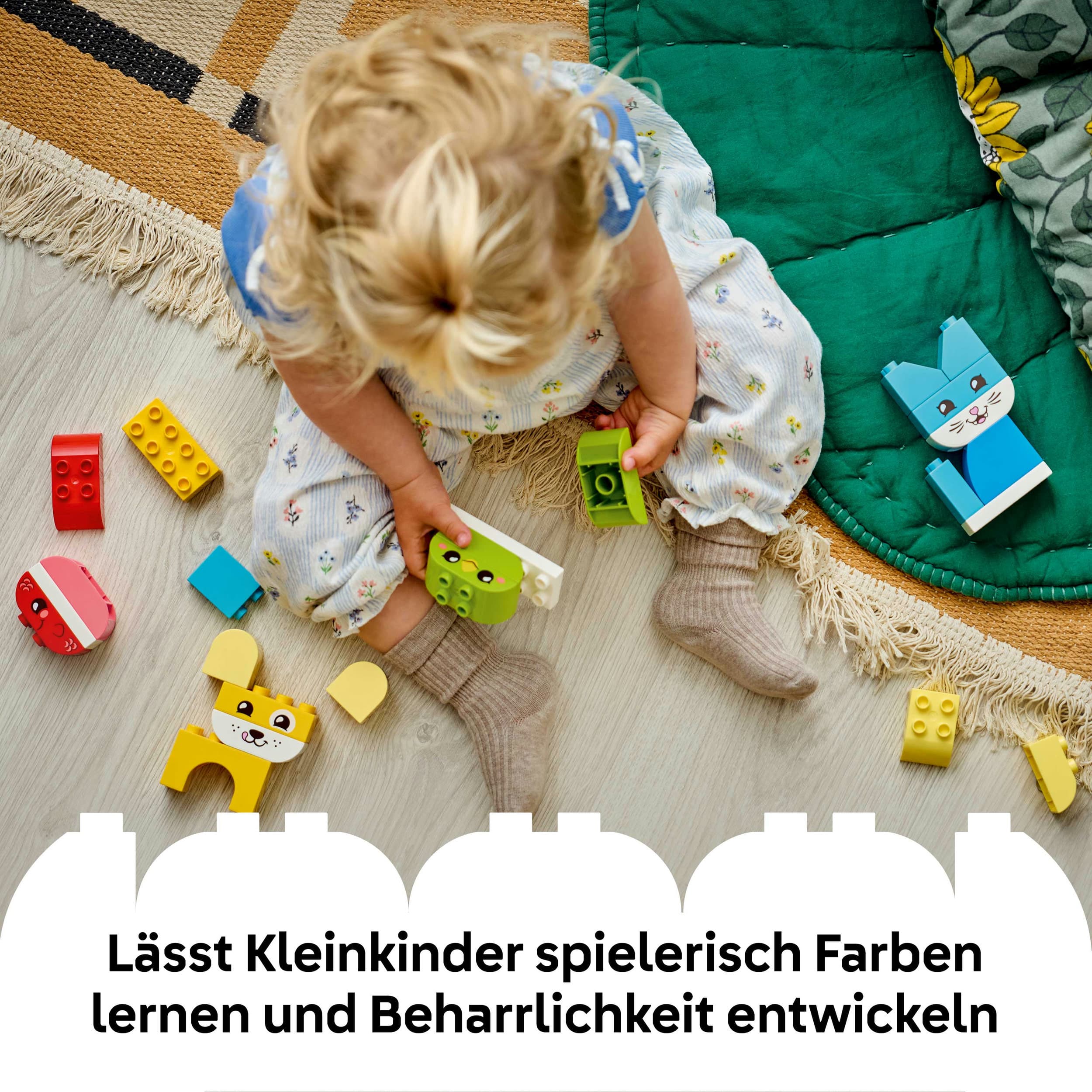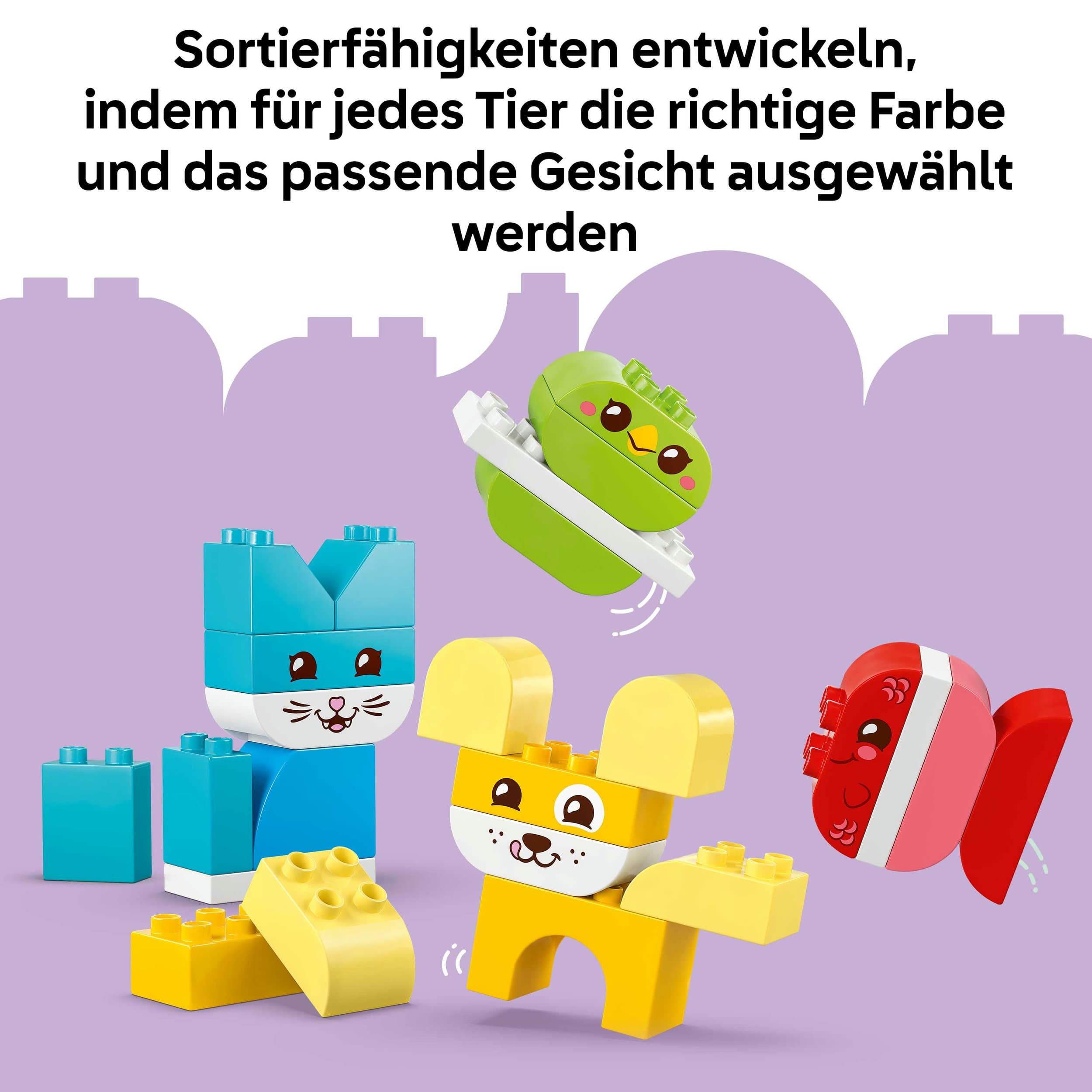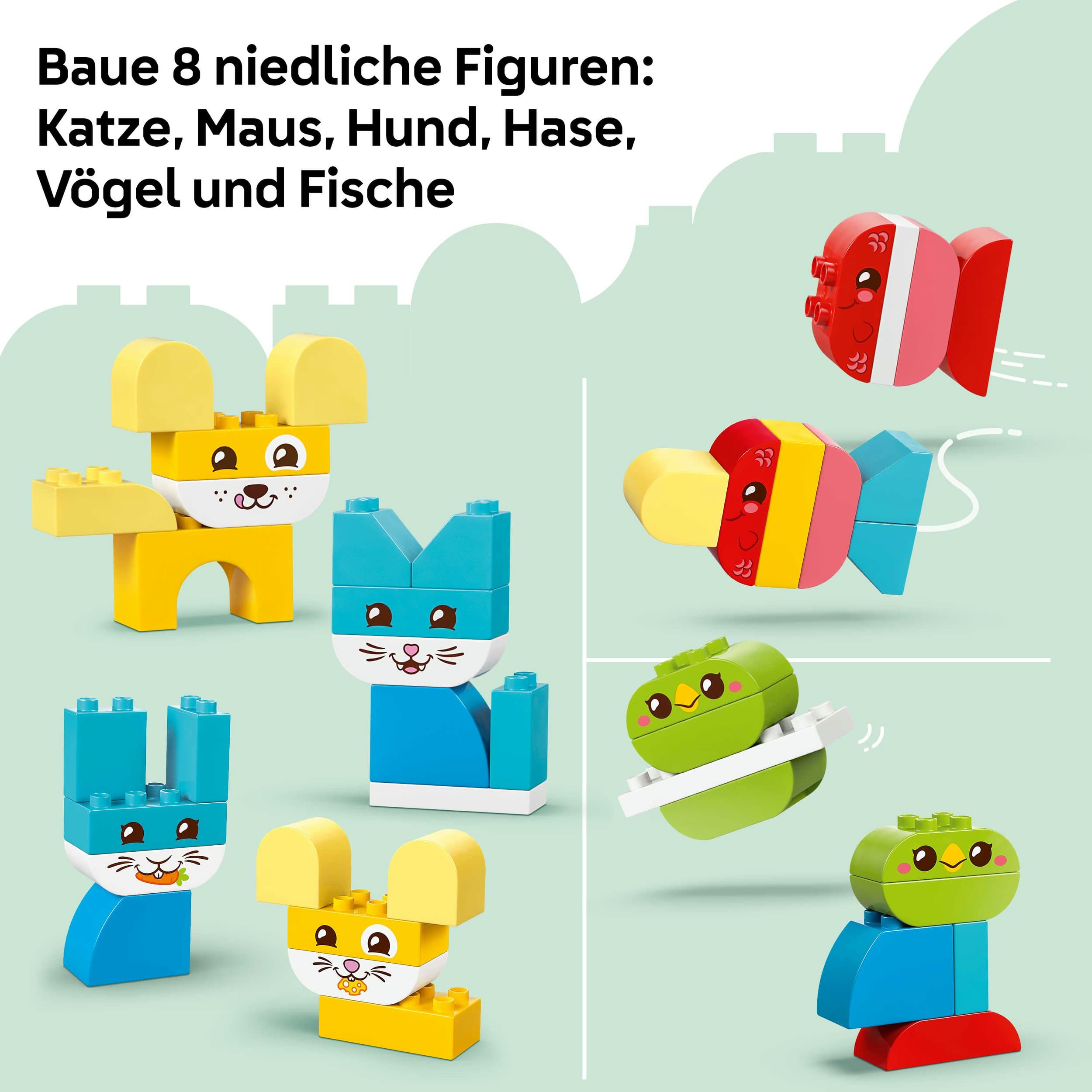 Die 24 gut greifbaren Bausteine wurden speziell für die kleinsten Kinder entwickelt. Kleine Baufans können diese Teile benutzen, um einen Hund, eine Katze, Vögel, einen Hasen, eine Maus und Fische zu bauen. Einige dieser Spielzeugtiere für junge Kinder werden mit einfarbigen LEGO DUPLO Bausteinen dargestellt. Kleine Baufans lernen das Sortieren nach Farben, um ihr Tier zu erschaffen. Wenn sie der Figur dann noch ein freundliches Gesicht aufstecken, ist ihr niedliches Tier fertig.