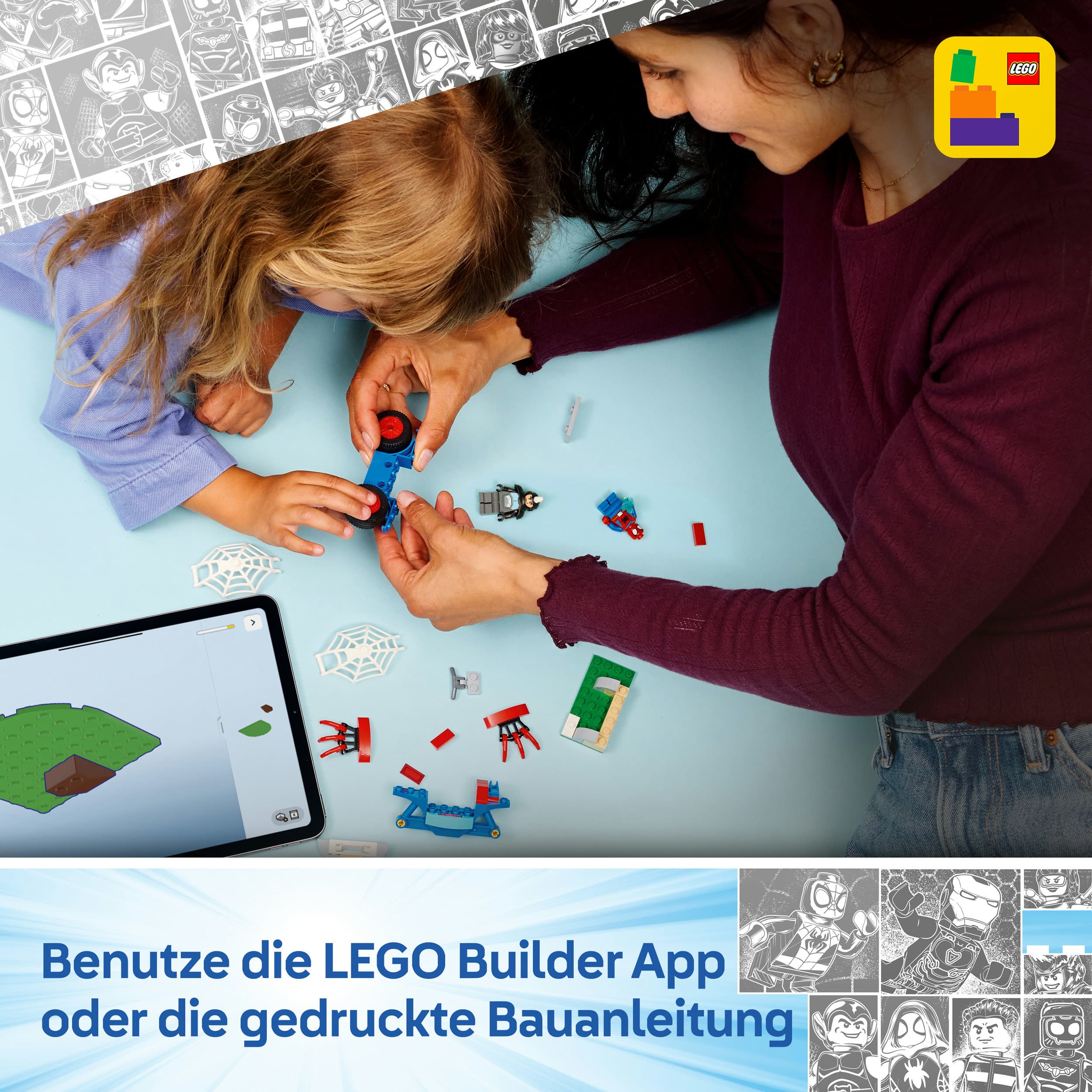 Die Kinder helfen Spidey, einen gestohlenen blauen Edelstein zurückzuholen, weichen Pizza aus, die Rhino mit seinem Pizzaofen-Shooter auf sie schleudert, und fangen Rhino in einem riesigen Spinnennetz, das sogar hinten aufs Motorrad passt. Dieses Bauset für junge Baufans strotzt nur so vor Details, die Kinder viele Stunden fantasievoll spielen lassen. Das Bauspielzeug ist ein tolles Geburtstagsgeschenk für Fans von Spidey und seine Super-Freunde. Bunte Bildanleitungen, große Starter-Bauelemente und separate Beutel mit jeweils 1 Modell lassen Kinder rasch bauen und sofort spielen. In der LEGO Builder App mit verständlichen digitalen Bauanleitungen vergrößern und drehen Kinder 3D-Modelle und sehen, wie weit sie mit ihrem Modell schon sind. Das Set besteht aus 61 Teilen.