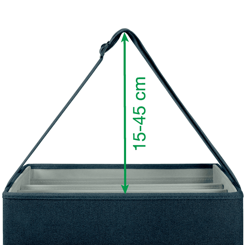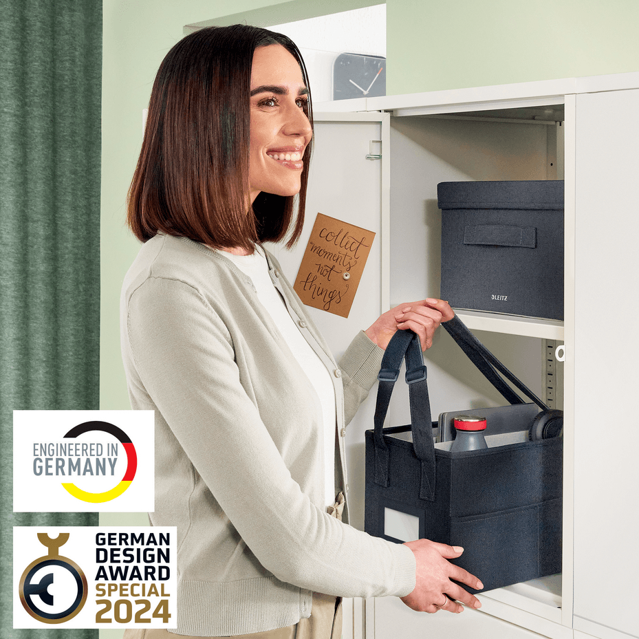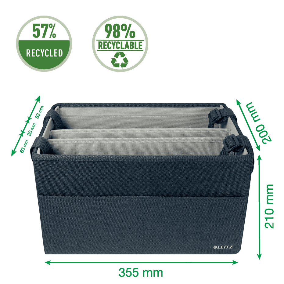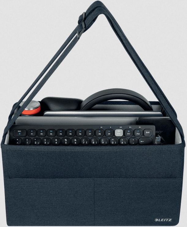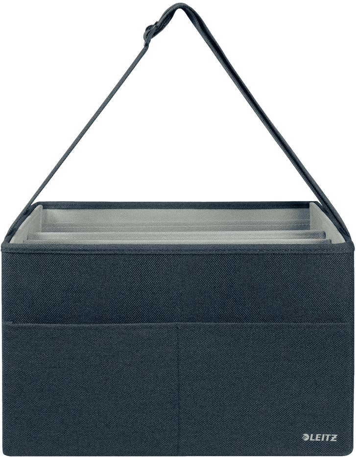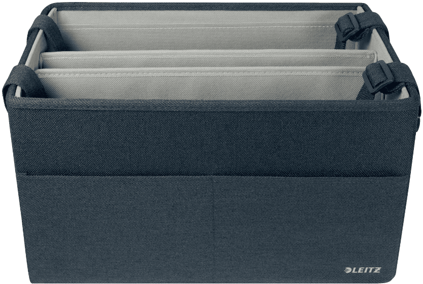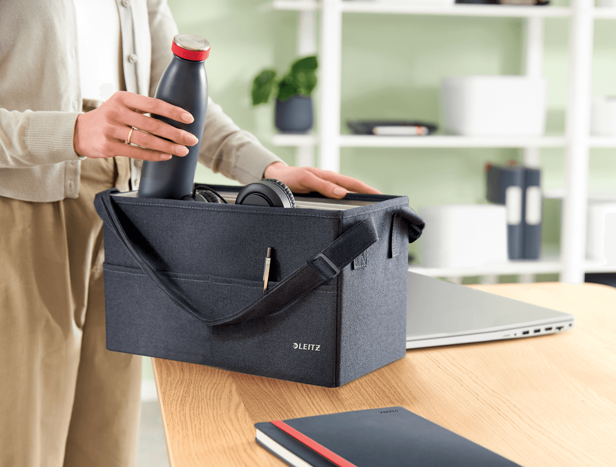 Faltbare, kompakte Desk Sharing Tasche, ideal für die Organisation im Büro, zu Hause, beim hybriden Arbeiten oder in der Schule, auch ideal als Lehrertasche · Konzipiert für die Aufbewahrung eines Laptops bis zu 14 Zoll, einer Kompakttastatur, einer Maus, eines Ladekabels, eines Headsets, eines Notizbuchs, einer Wasserflasche und anderer täglicher Bedarfsartikel; passt in Schließfächer oder Schränke mit Mindestmaßen von 370 x 210 mm und einer Höhe von 220 mm · Verfügt über 3 Fächer, um den Inhalt zu ordnen, mit einem zentralen Bereich zur Aufbewahrung eines Laptops und einem Namensschild zur einfachen Identifizierung der Tasche in gemeinsam genutzten Büroräumen · Schnelle und einfache Montage durch einfaches Auffalten der Tasche, ohne Klebstoff · Vollständig zusammenklappbar zur platzsparenden Lagerung bei Nichtgebrauch · 2 elegante Tragegriffe, die sich verstellen lassen, um die Desk Sharing Tasche in der Hand oder über der Schulter zu tragen, verstellbare Länge 150-450 mm für zusätzlichen Komfort · Leichte und robuste Aufbewahrungstasche für bis zu 8 kg Gewicht · Das Produkt kann vollständig auseinander gebaut werden, besteht zu 57 % aus recyceltem Material und ist zu 98 % recycelbar, plastikfreie Verpackung · Weiches Material zum Schutz des Inhalts, verstärkt mit starkem Recyclingkarton für Stabilität und Haltbarkeit · Die Stoffaufbewahrungsserie von Leitz kombiniert Komfort im Wohnbereich mit hochwertiger Qualität, um eine positive und produktive Arbeitsumgebung zu schaffen ·