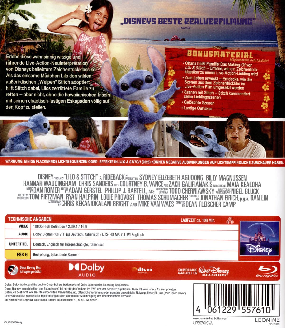 | Zusatzinfos / Bonusmaterial beim Film dabei | Ohana heißt Familie: Das Making-Of von Lilo & Stitch / Zum Leben erweckt / Lustige Outtakes / Szenen mit Stitch / Gelöschte Szenen |