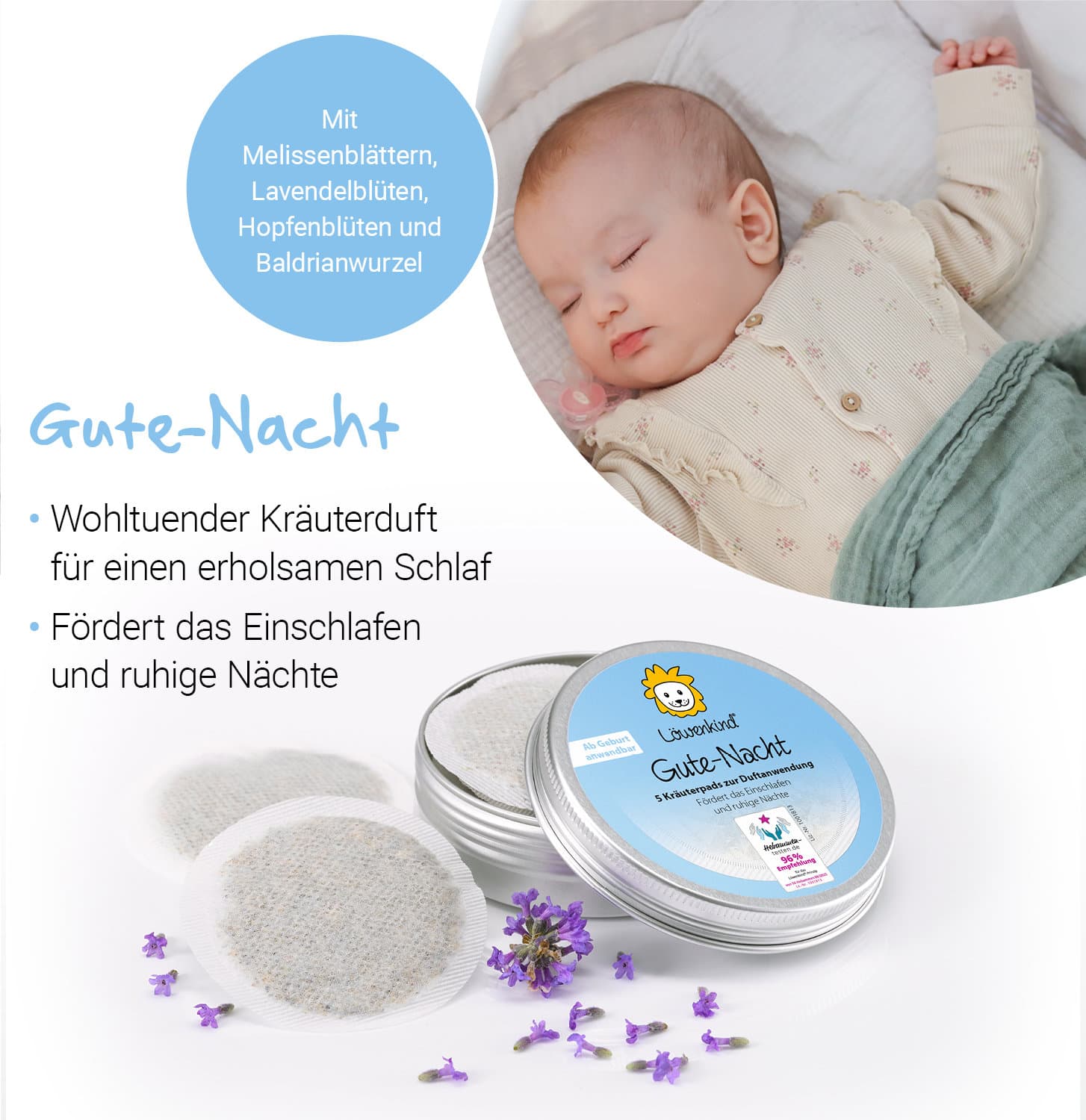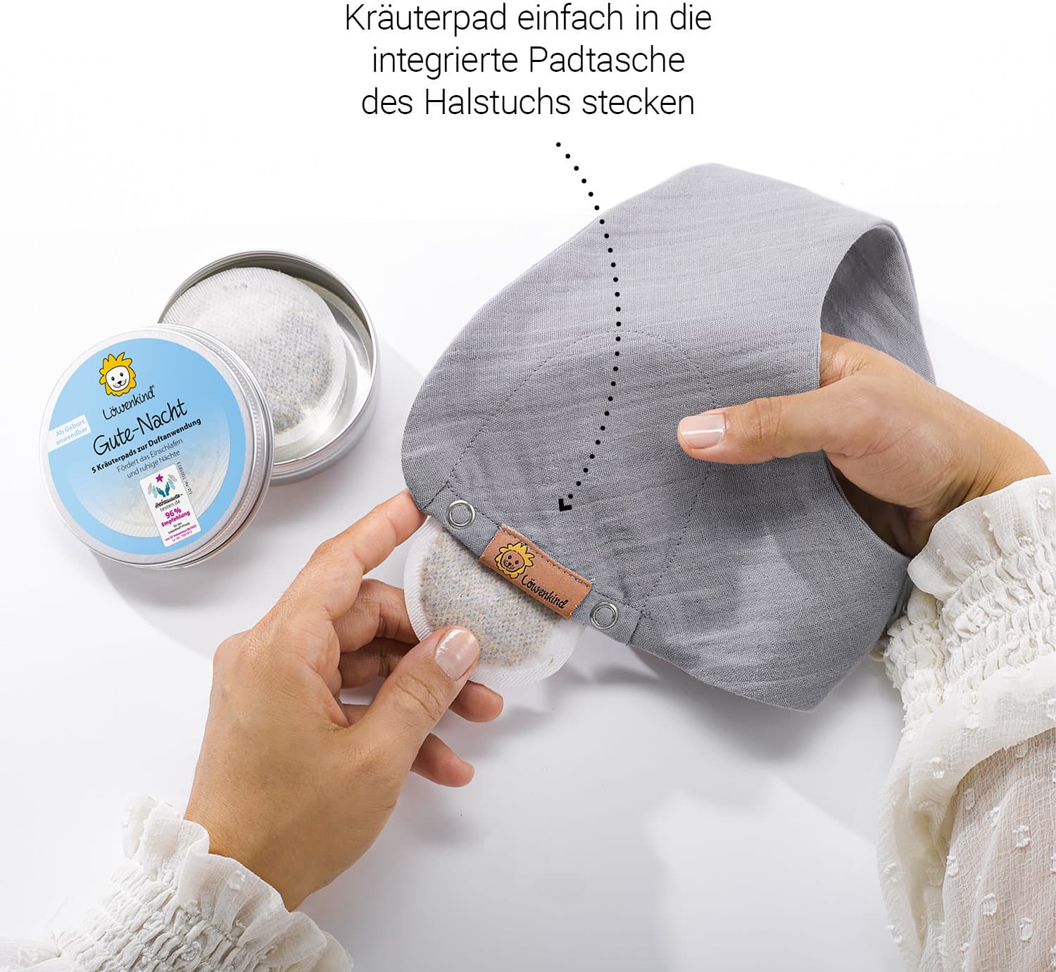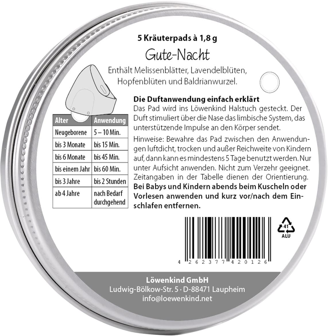 Die LÖWENKIND Gute-Nacht Pads entfalten durch Körperwärme einen wohltuenden Kräuterduft und begleiten sanft in den Schlaf.