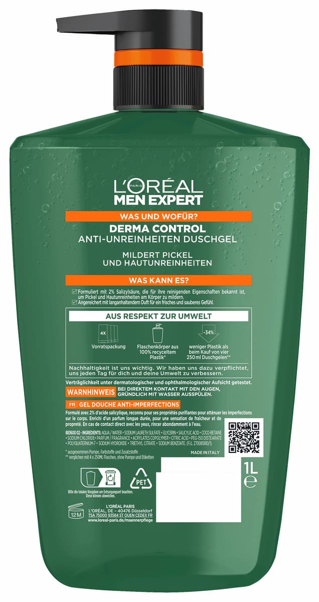 AnwendungshinweisDas Derma Control Anti-Unreinheiten Duschgel von L’Oréal Paris Men Expert auf die angefeuchtete Haut des Körpers auftragen und dort aufschäumen sowie gleichmäßig verteilen. Dabei die Augenpartie aussparen. Im Anschluss den Schaum sorgfältig unter warmem Wasser abspülen.