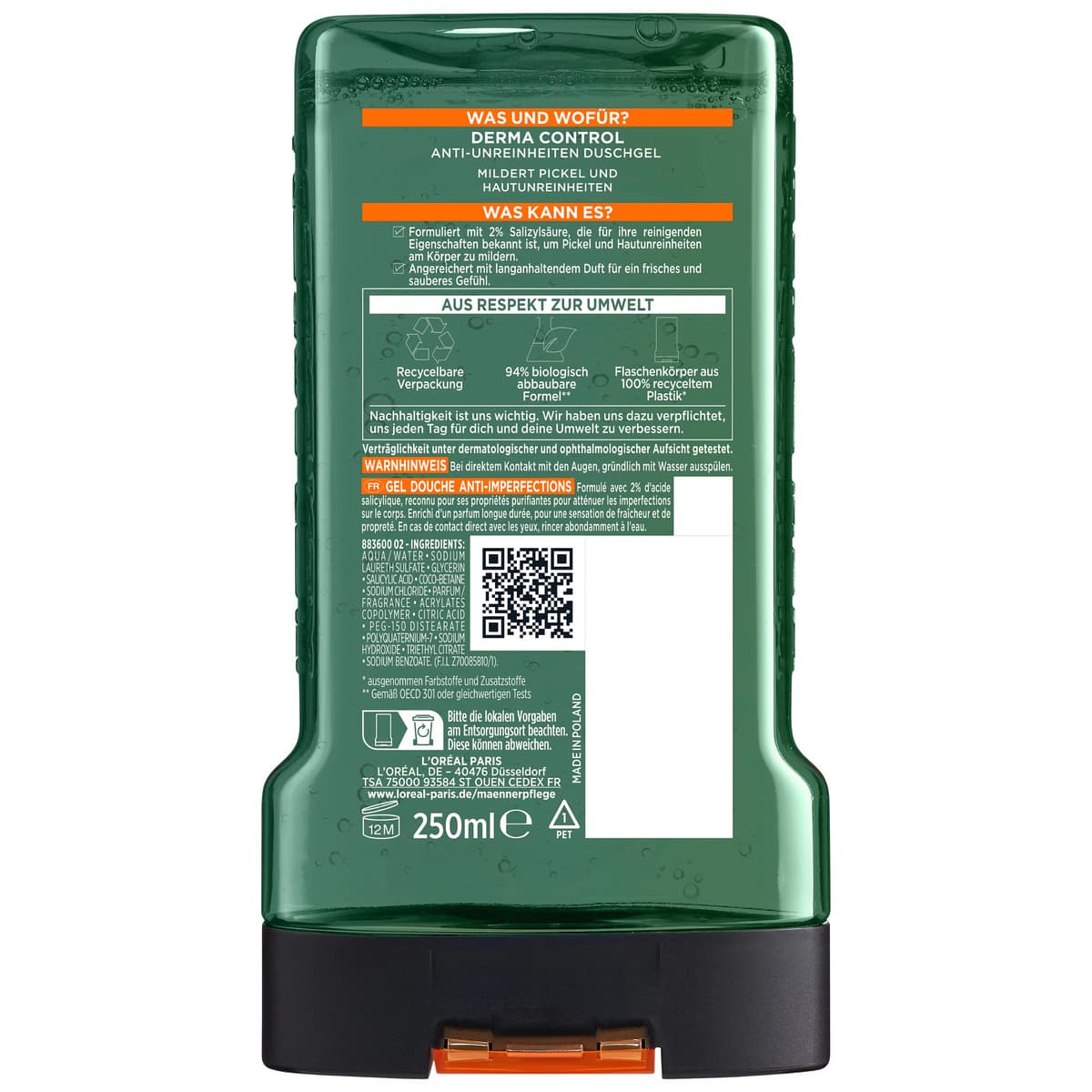 | Anwendungshinweis | Das Derma Control Anti-Unreinheiten Duschgel von L’Oréal Paris Men Expert auf die angefeuchtete Haut des Körpers auftragen und dort aufschäumen sowie gleichmäßig verteilen. Dabei die Augenpartie aussparen. Im Anschluss den Schaum sorgfältig unter warmem Wasser abspülen. |