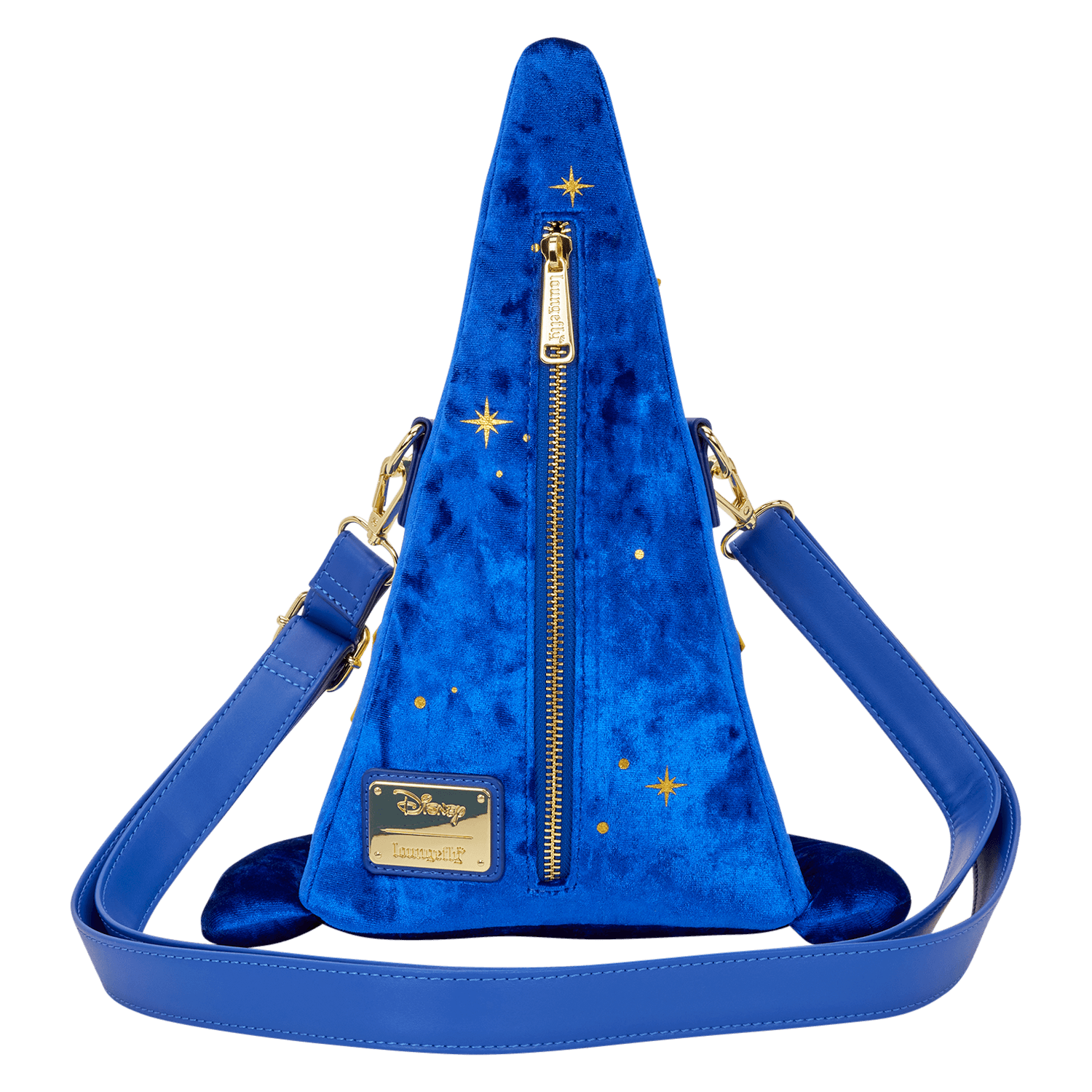 Diese figurative Umhängetasche hat die Form von Mickeys Zaubererhut aus Disneys Fantasia. Sie besteht aus zerknittertem blauem Samt, metallischen Sternen und Monden aus Kunstleder und ist mit goldenen Stickereien verziert! Damit können Sie Ihre Liebe zu Fantasia stolz zur Schau stellen!
