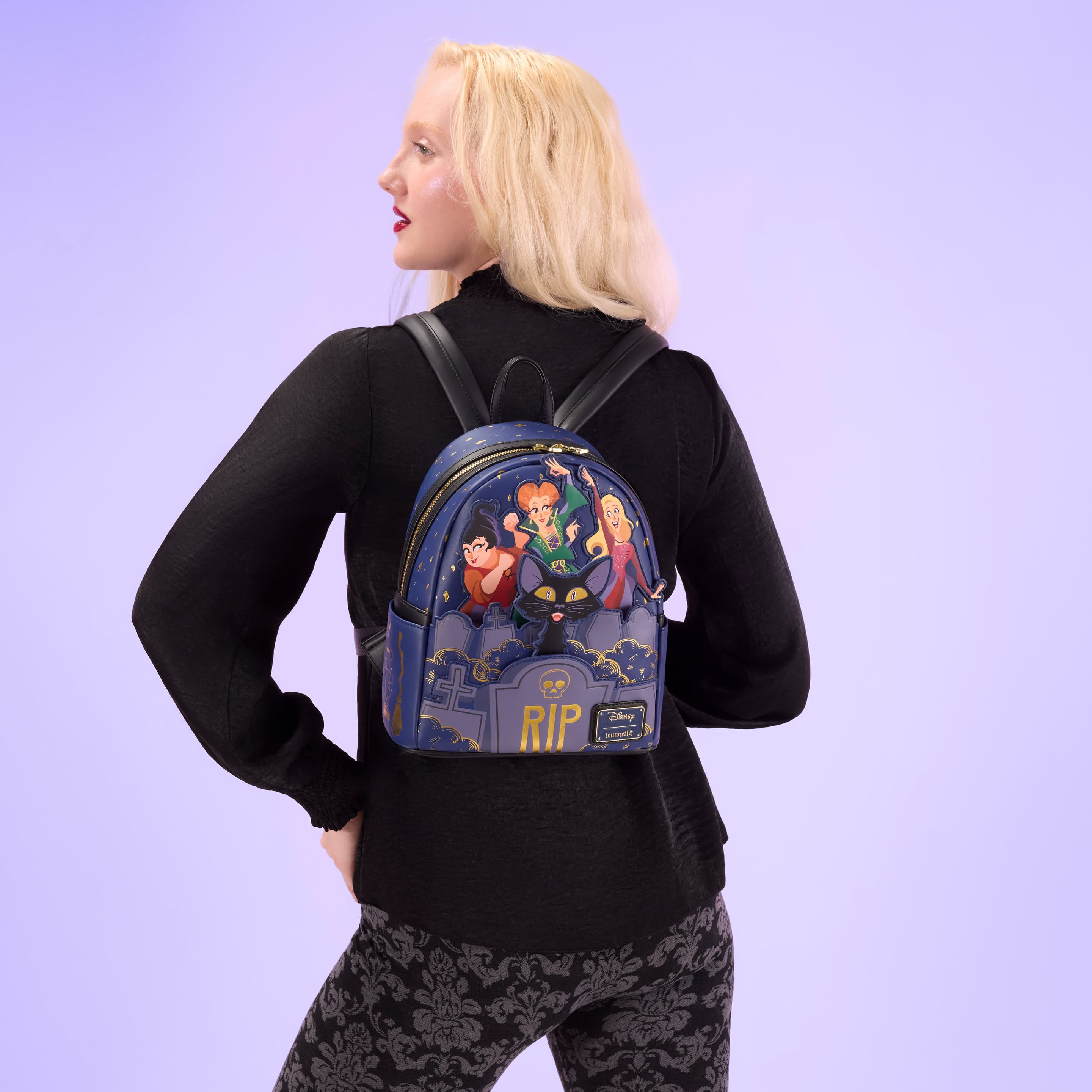 Dieser Mini-Rucksack zeigt die Sanderson-Schwestern aus Disneys Hocus Pocus. Sie tanzen gemeinsam unter dem Sternenhimmel auf einem Friedhof. Binx taucht hinter einem Grabstein auf! Auf den Seitentaschen finden Sie goldfarbene Details ihrer Besen.