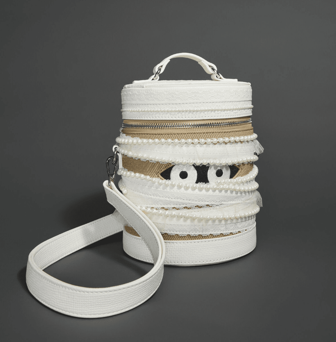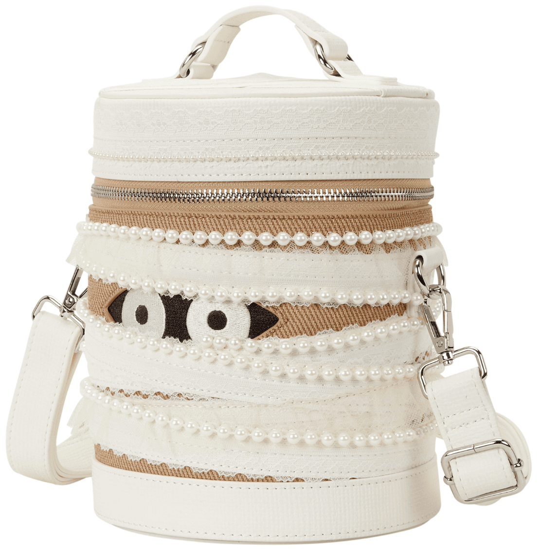 Verleihe deinem Outfit einen Hauch von Grusel-Chic mit der Loungefly Mummy Figural Crossbody Bag! Diese zylindrische Umhängetasche ist ein echter Eyecatcher und kombiniert Tüll, Kunstleder, Häkel-Details und Stickereien zu einem verspielten Mumien-Look. Die gestickten Augen, die durch die „Verbandlagen“ blitzen, sowie Glitzer und Kunstperlen sorgen für einen charmanten, spooky Touch – perfekt für Halloween, Conventions oder den Alltag mit Stil.
