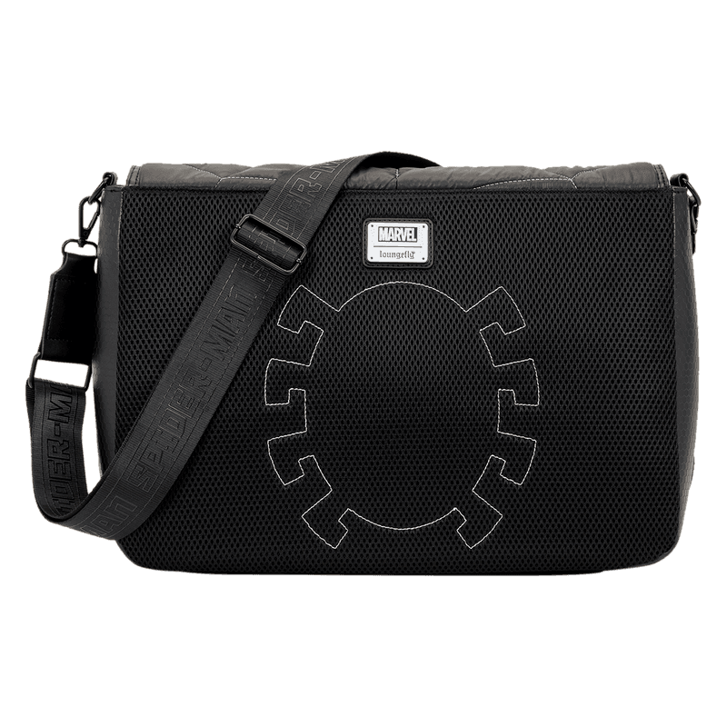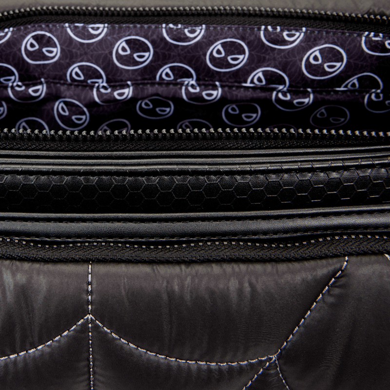 Diese Umhängetasche besteht aus gestepptem Material mit einer Applikation des Spider-Man-Spinnenlogos auf der Vorderseite. Heben Sie die obere Klappe an, um ein Kunstwerk von Spider-Mans Maske zu entdecken. Auf dem Umhängegurt ist außerdem „Spider-Man” aufgedruckt.