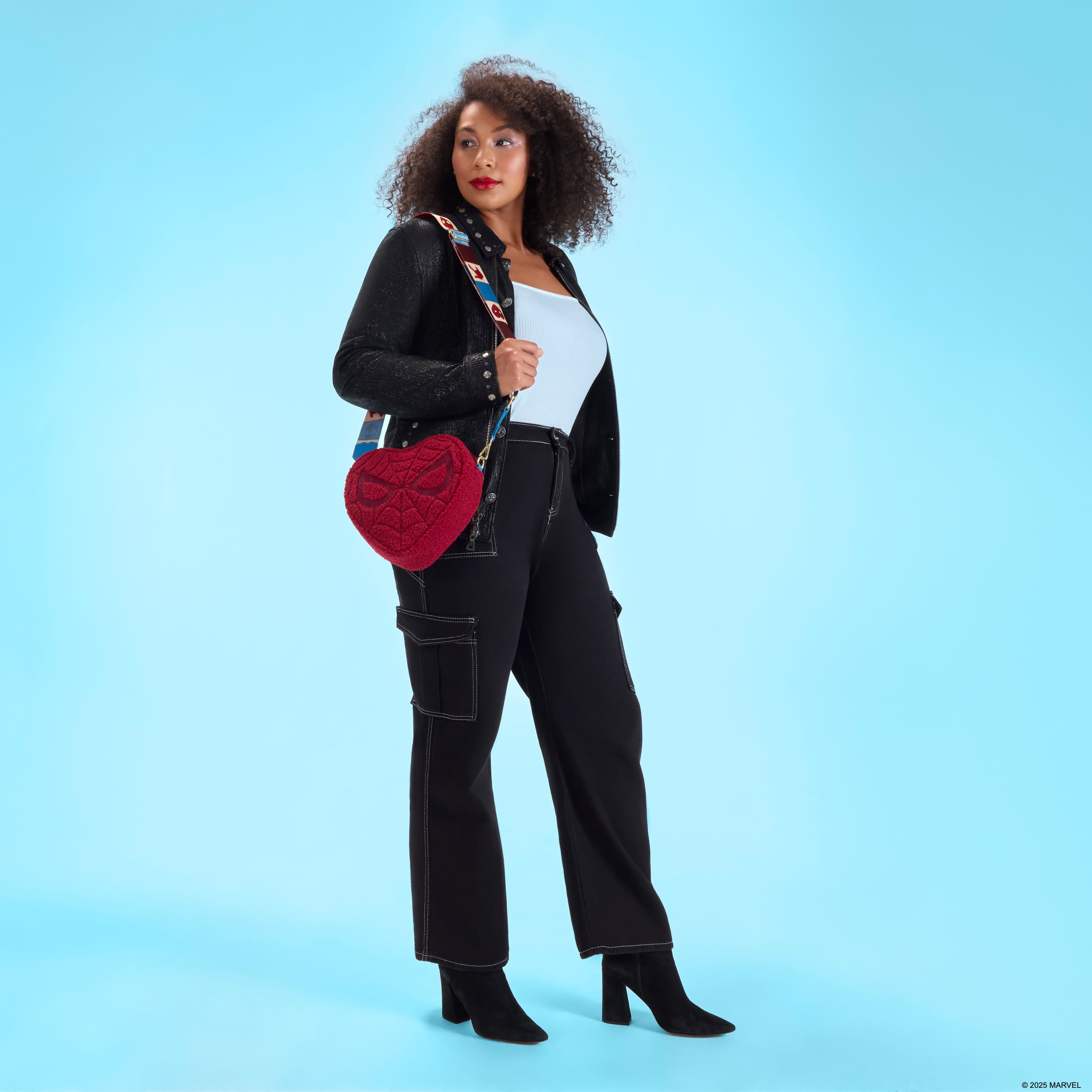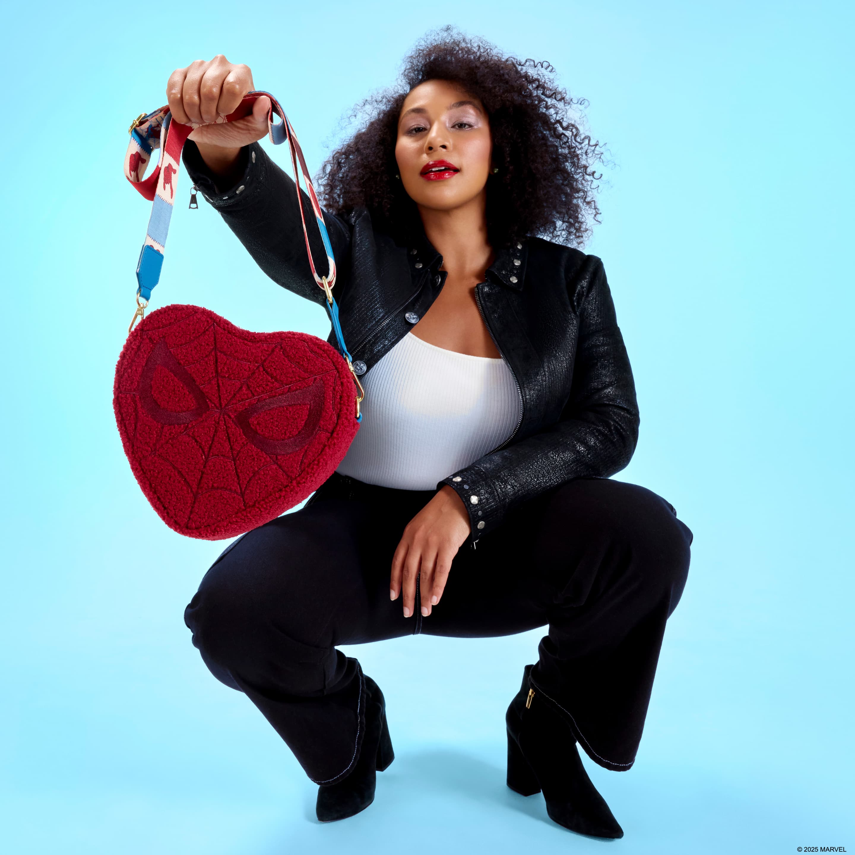 Diese Umhängetasche hat die Form eines Herzens und ist mit Spider-Mans Maske verziert! Sie ist mit Sherpa-Material überzogen. Entlang des Riemens finden Sie verschiedene Symbole von Spider-Man in Quadraten, die wie zusammengenäht aussehen. Dies ist ein supersüßes Accessoire, das perfekt ist, um Ihren Lieblingssuperhelden zu zeigen!