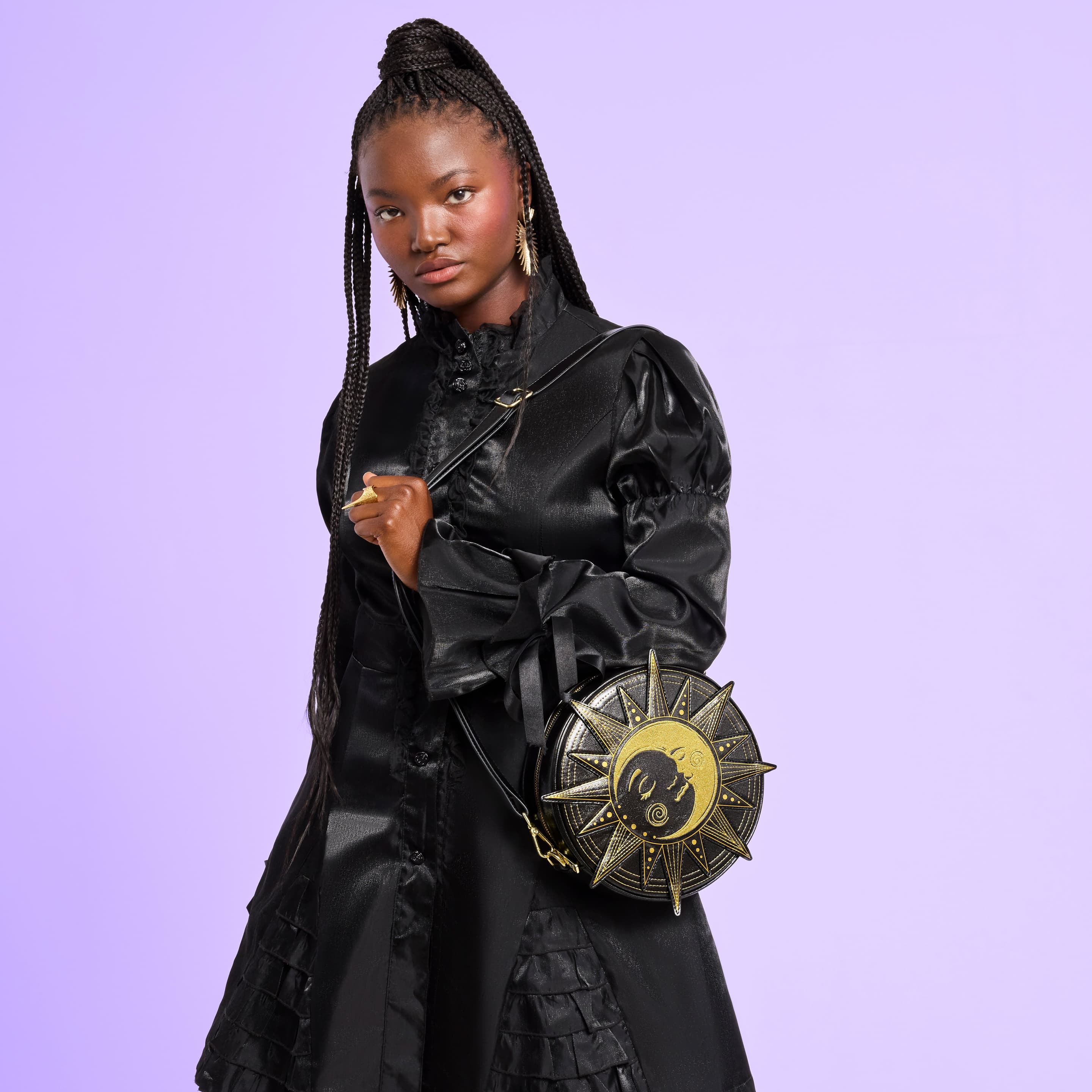 Diese Umhängetasche ist bereit, mit jedem Teil Ihrer Garderobe ein Statement zu setzen! Sie ist rund und mit einer Sonne und einem Mond verziert, die sich aneinander schmiegen. Drehen Sie die Tasche um, um funkelnde Sterne am wolkenverhangenen Nachthimmel zu entdecken. Metallisches Kunstleder lässt die Details richtig zur Geltung kommen!