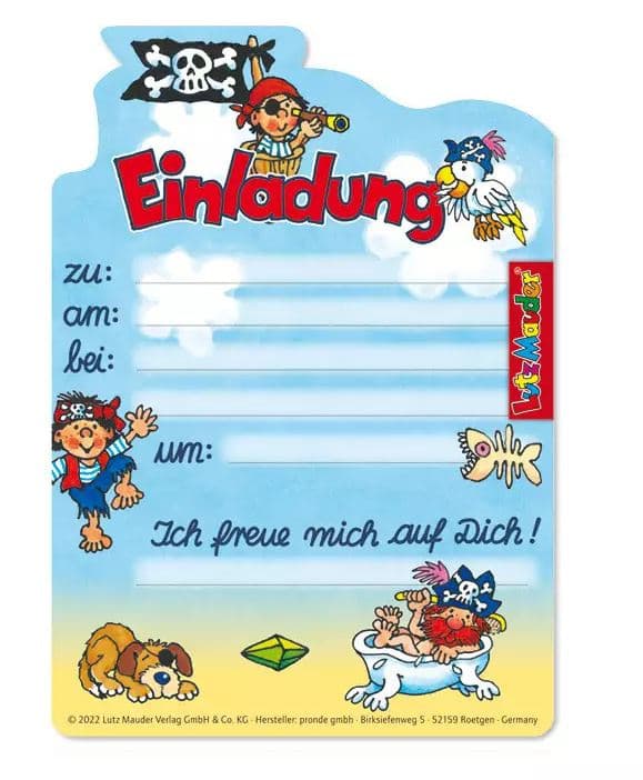 8 formgestanzte Einladungskarten mit passenden farbigen Umschlägen im Set. Passend zu den Party-Produkten von Lutz Mauder.