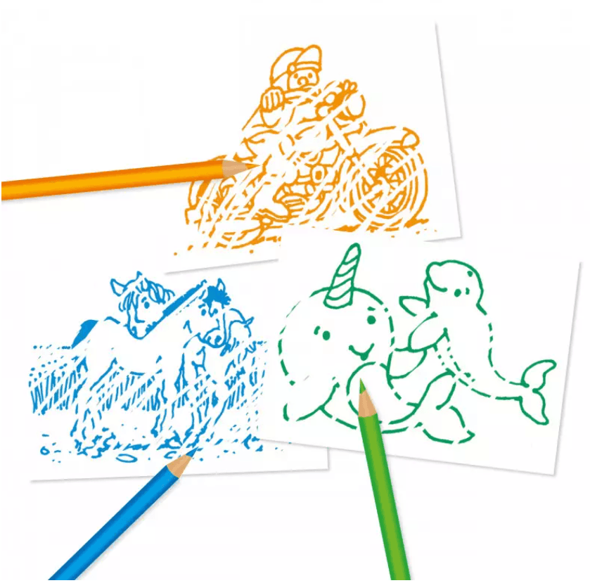 Die Weißen Blätter kannst du mit einem weichen Bleistift oder Regenbogenstift schraffieren, schon entstehen - wie von Zauberhand - weitere lustige Motive.