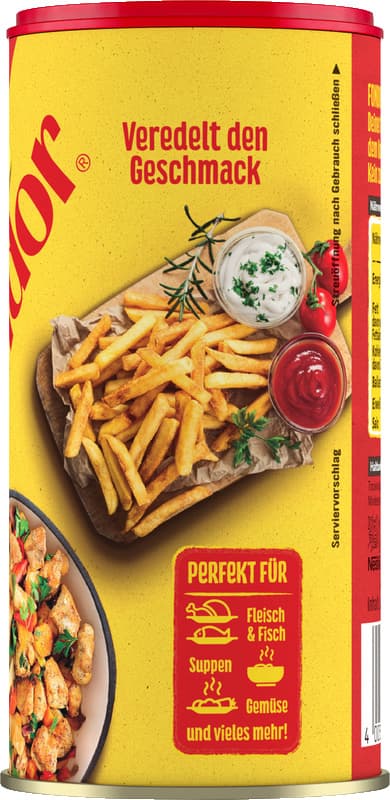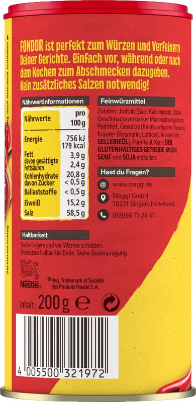 Ob zum Gemüse, Fleisch oder Fisch Würzen, als Suppenwürze oder als Würzmittel für Pommes Frites – mit der praktischen MAGGI Fondor Vorratsdose hat man für jedes Gericht das passende Gewürz im Haus. Auch zum Verfeinern leckerer Nudel- und Kartoffelgerichte und zum Abschmecken knackiger Salate ist Fondor perfekt! Einfach beim Kochen dazugeben oder das Essen direkt am Tisch verfeinern. Lecker würzen – ganz ohne zusätzliches Nachsalzen – so geht modernes Kochen heute! MAGGI Fondor in der praktischen 200 g Dose mit Streuaufsatz kann individuell dosiert werden. Für alle, die gerne kochen und kräftig gewürzte Gerichte lieben, ist das Feinwürzmittel im Vorratsformat die ideale Wahl.