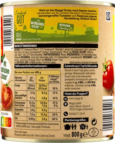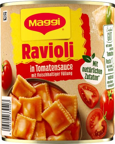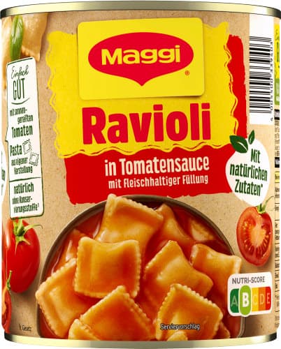 | Zubereitungshinweis | Zubereitung in Topf & Mikrowelle: Ravioli in einen Topf geben und bei geringer Wärmezufuhr heiß werden lassen oder in ein mikrowellengeeignetes Serviergeschirr geben und zugedeckt ca. 4 Min. bei 600 Watt erwärmen. Umrühren und ca. 4 Min. weiter erwärmen. |