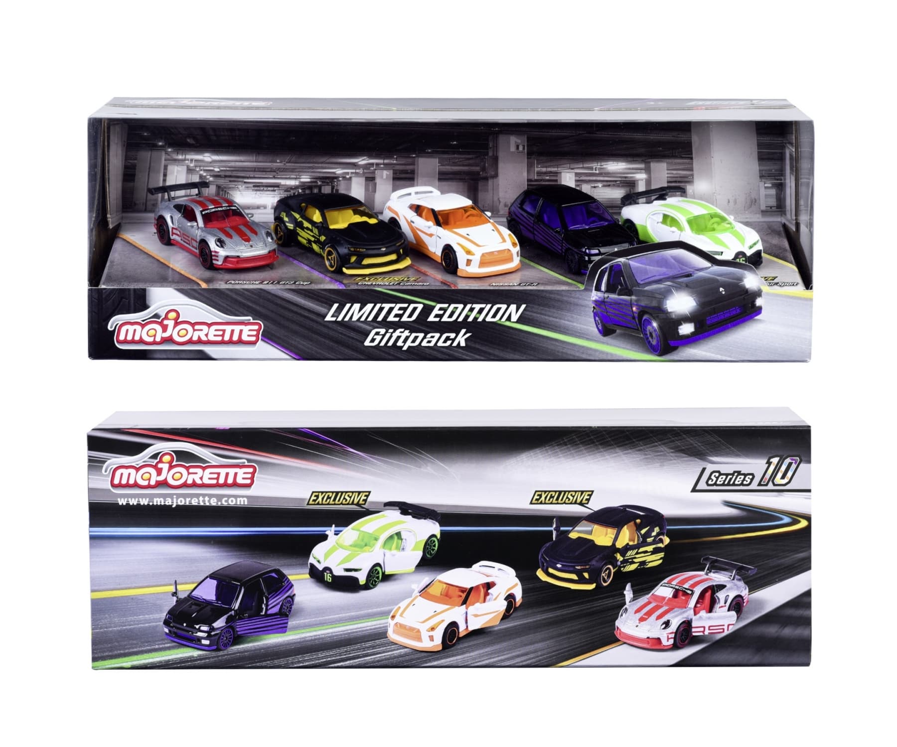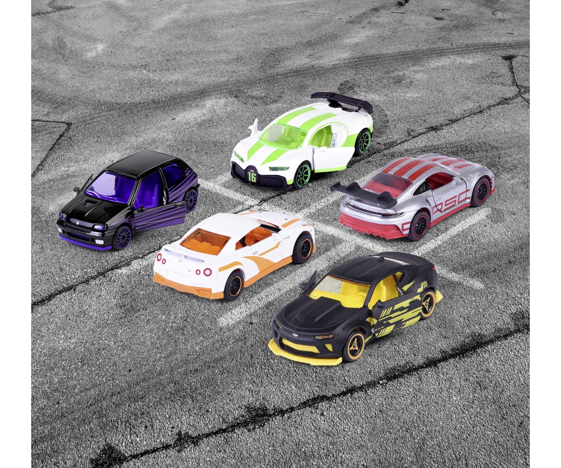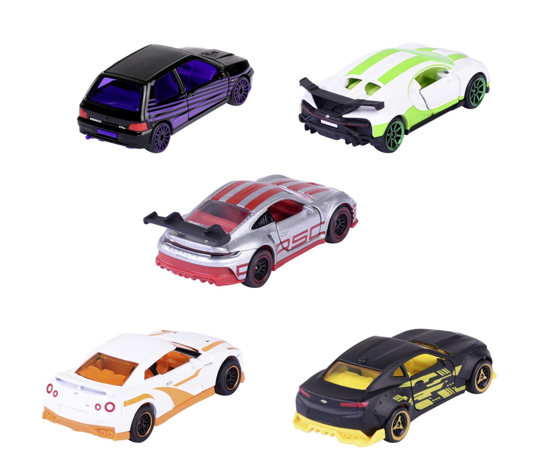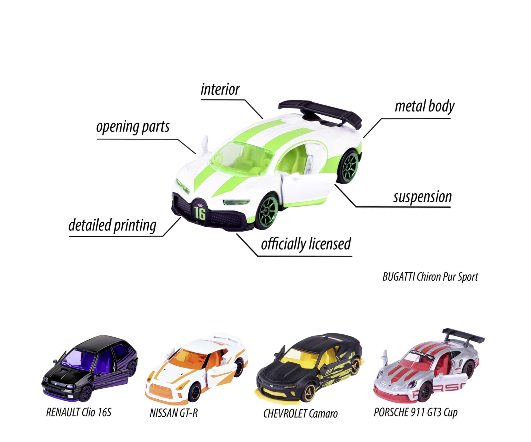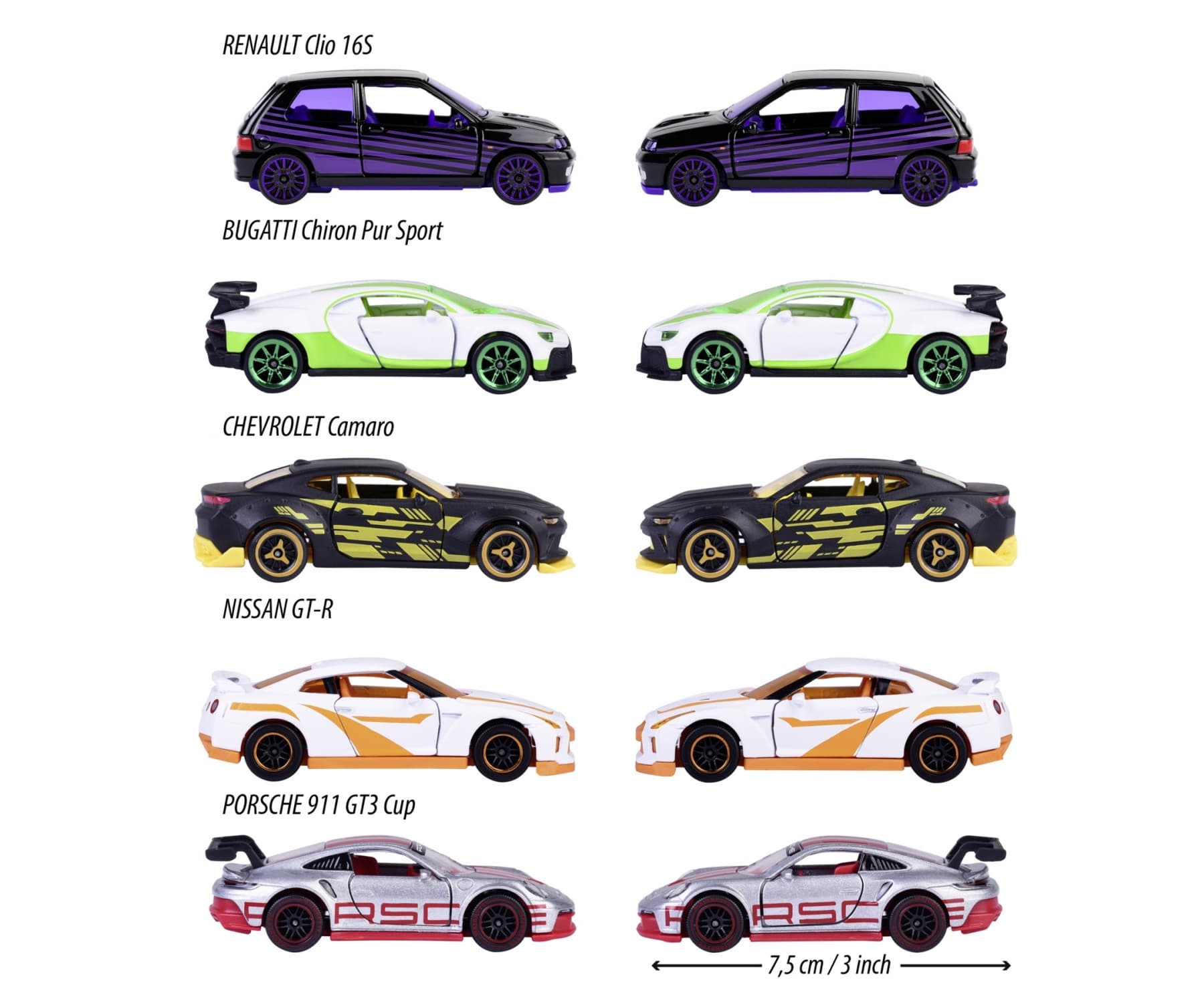 Majorette Auto-Set Limited Edition 10 - Geschenkset mit 5 Modellautos (Renault, Porsche, Nissan, Bugatti, Chevrolet), Autos aus Metall mit Freilauf, je 7,5 cm, für Kinder ab 3 Jahre • Majorette Spielzeugauto-Set - Beliebte Auto-Modelle in außergewöhnlichem Look: Im Geschenk-Set der Majorette Limited Edition 10 versammeln sich 5 spektakuläre Modellautos mit einer Länge von je 7,5 cm. • 5er Autoset - Du erhältst 5 verschiedene Autos: 1. Renault Clio 16S (schwarz), 2. Porsche 911 GT3 Cup (grau), 3. Nissan GT-R (weiß), 4. Bugatti Chiron Pur Sport (weiß), 5. Chevrolet Camaro (schwarz) • Spezielles Design - Jedes Fahrzeug ist ein echtes Highlight: Die offiziell lizenzierten Metallautos sind jeweils in einer besonderen Farbkombination lackiert - z.T. sogar mit passender Tönung der Fensterscheiben! • Spielzeug-Ausstattung - Damit die robusten Cars auch als Spielzeugautos für Kinder ab 3 Jahren überzeugen, verfügen die Spielautos aus Metall über Freilauf, Federung und zu öffnende Teile. • Majorette - Als einer der bekanntesten Hersteller von Modellfahrzeugen kombinieren wir Tradition mit Innovation - seit 1964. Unsere Modelle zeichnen sich durch ihre erstklassige Verarbeitung aus. 5er-Set Modellautos: Majorette Limited Edition 10 Seite an Seite präsentieren sich die 5 Majorette Metallautos der Series 10 in ihrer ganzen Pracht. Dabei ist jedes Auto für sich ein absolutes Highlight. Vom luxuriösen Bugatti Chiron Pur Sport mit seiner aerodynamischen Eleganz über den markanten Chevrolet Camaro bis zum sportlichen Porsche 911 GT3 Cup: Jedes Miniatur-Modell fängt die Essenz des Original-Automodells perfekt ein! Majorette Geschenkset mit 5 Spielzeugautos ab 3 Jahren: 1. Renault Clio 16S (schwarz) 2. Porsche 911 GT3 Cup (grau) 3. Nissan GT-R (weiß) 4. Bugatti Chiron Pur Sport (weiß) 5. Chevrolet Camaro (schwarz) Offiziell lizenziertes Auto Spielzeug aus Metall Um die Faszination der Rennautos spielerisch zu erleben, verfügen die 5 Premium-Autos über eine Freilauffunktion, eine Federung sowie Teile zum Öffnen. So wird der Blick auf die faszinierenden Details im Inneren freigegeben: Jedes Auto erzählt eine eigene Geschichte! Die Kombination von gleich 5 beeindruckenden Spielzeug Autos macht das 5er Giftpack zum optimalen Geschenk für kleine und große Autofans. Ob zum Geburtstag, als Weihnachtsgeschenk oder als kleine Geschenkidee für Zwischendurch: Mit diesen 5 detailgetreuen Fahrzeug-Modellen verschenken Sie pure Raffinesse und Eleganz auf 4 Rädern! Über Majorette Die Kultmarke aus Frankreich verzaubert seit 1964 Autofans auf der ganzen Welt. Die realitätsgetreuen und original lizenzierten Modelle weltweit bekannter Automarken sind besonders hochwertig und widerstandsfähig. Von PKWs, Monstertrucks, Einsatz- und Baufahrzeugen bis hin zu Rennautos. Majorette bietet eine riesige Auswahl an Spielzeugautos aus Metall sowie dazu passende Parkhaus-Spielsets zu verschiedenen Themenbereichen. Die kleinen Spielzeugautos aus Metall sind ideal für Kinder ab 3 bzw. 5 Jahren und ambitionierte Sammler jeden Alters.