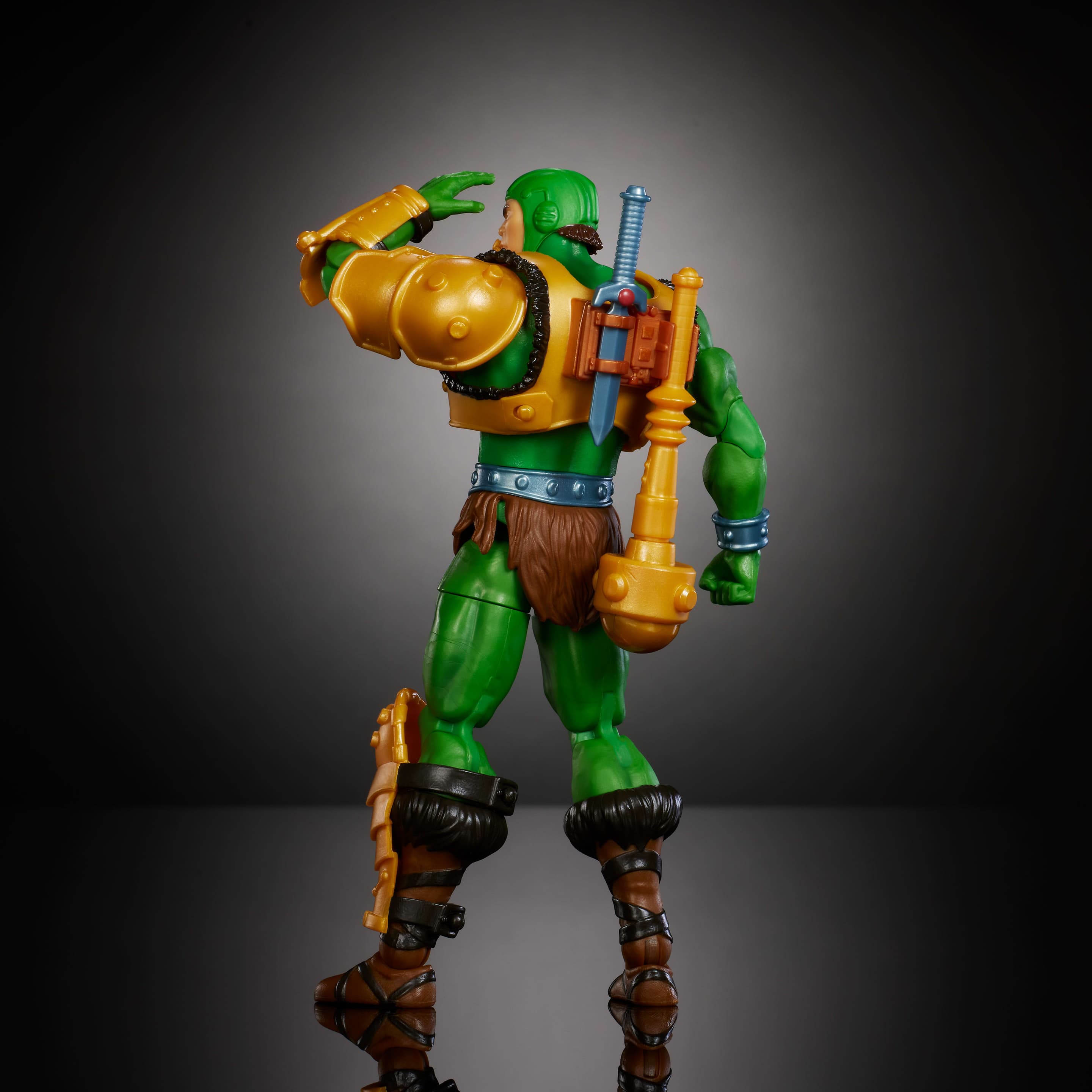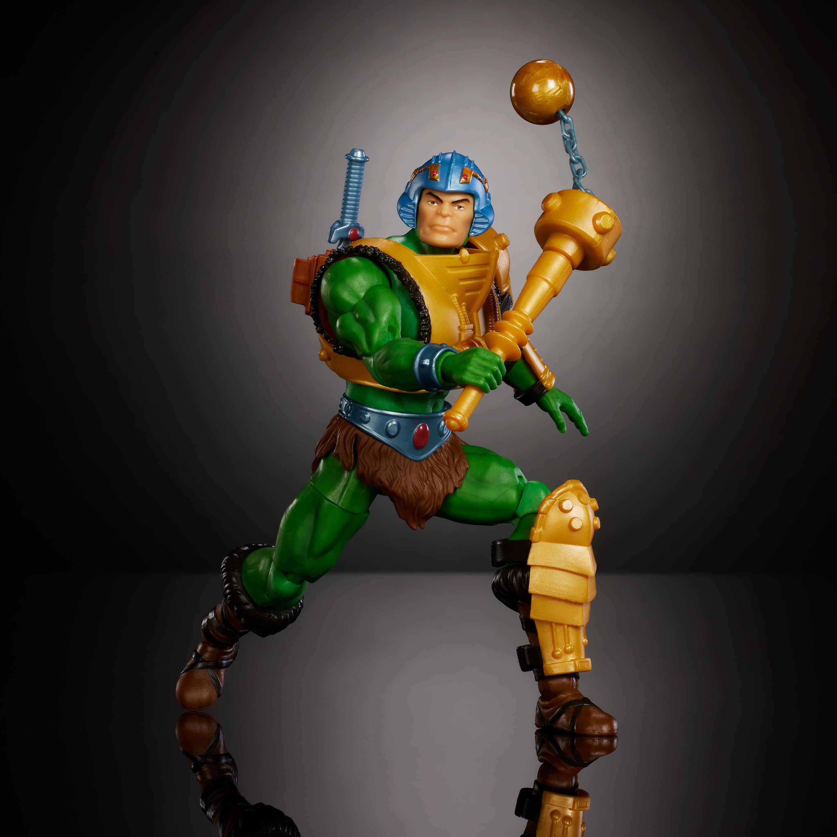 Man-At-Arms wird mit authentischem Charakterzubehör geliefert – eine Keule mit 2 austauschbaren Köpfen, einer mit schwenkbarer Kugel und Kette, sowie ein Messer und ein zusätzliches Paar Hände für verschiedene Posen.
