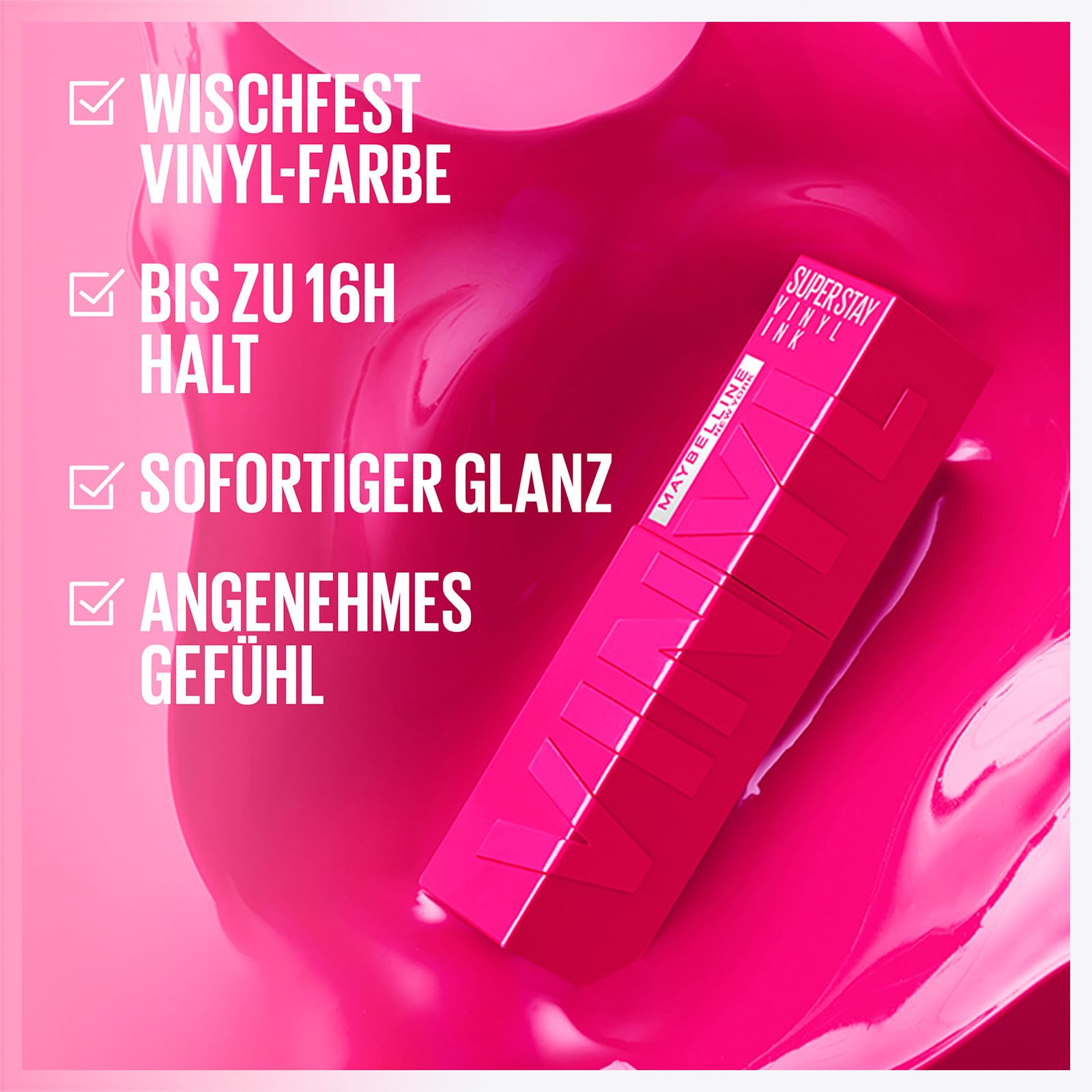 Der flüssige Maybelline New York Super Stay Vinyl Ink Lippenstift aus der Pink Mashup-Reihe kreiert ein sofort glänzendes Vinyl-Finish mit intensiver Farbe und bis zu 16H Halt - ganz ohne zu verschmieren oder zu verblassen! Der Maybelline New York Super Stay Vinyl Ink ist ein absoluter Game Changer! Der flüssige Lippenstift sorgt für intensive Farbe und ein Vinyl-Finish auf den Lippen. Die vegane*, langanhaltende Formel hält bis zu 16 Stunden und verhindert Verschmieren und Verblassen. Hochpigmentierte, elektrisierende Pinktöne den ganzen Tag – werde zum absoluten Trendsetter mit dem Vinyl Lippen-Look. *Ohne Inhaltsstoffe tierischen Ursprungs.