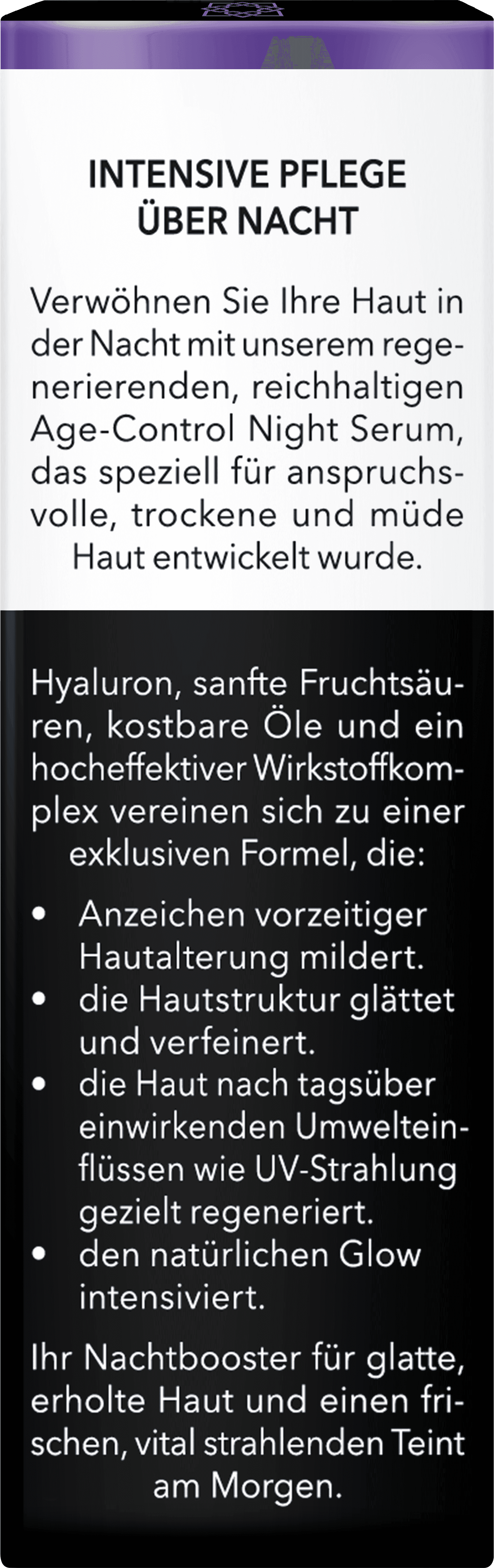 Das Age-Control Night Serum ist ein reichhaltiges Intensivserum, das speziell für trockene, anspruchsvolle und müde Haut entwickelt wurde. Die Formulierung kombiniert Hyaluron, sanfte Fruchtsäuren, wertvolle Öle und einen hochwirksamen Wirkstoffkomplex. Zeichen vorzeitiger Hautalterung werden gemildert, die Hautstruktur geglättet und die Regeneration nach täglichen Belastungen durch UV-Strahlung und Umwelteinflüsse unterstützt. Phytoaktive Inhaltsstoffe fördern die nächtliche Erholung und tragen zu einem vitalen, strahlenden Hautbild bei. Die Haut wirkt am Morgen frischer, glatter und gestärkter. Konturen werden gefestigt und der natürliche Glow intensiviert.