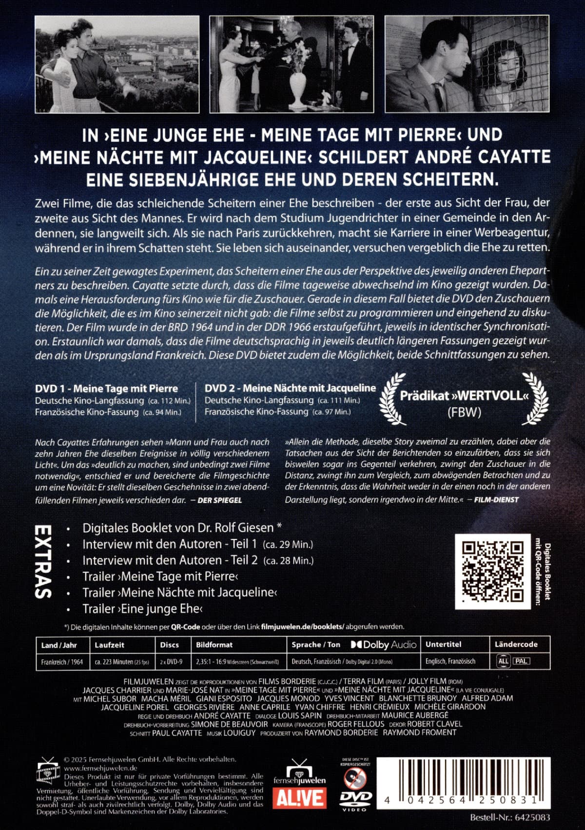 | Zusatzinfos / Bonusmaterial beim Film dabei | Digitales Booklet (online abrufbar) von Dr. Rolf Giesen; Interview mit den Autoren Teil 1 (ca. 29 Min.); Interview mit den Autoren Teil 2 (ca. 28 Min.); Trailer "Meine Tage mit Pierre"; Trailer "Meine Nächte mit Jacqueline"; Trailer "Eine junge Ehe"; Schuber; Wendecover |