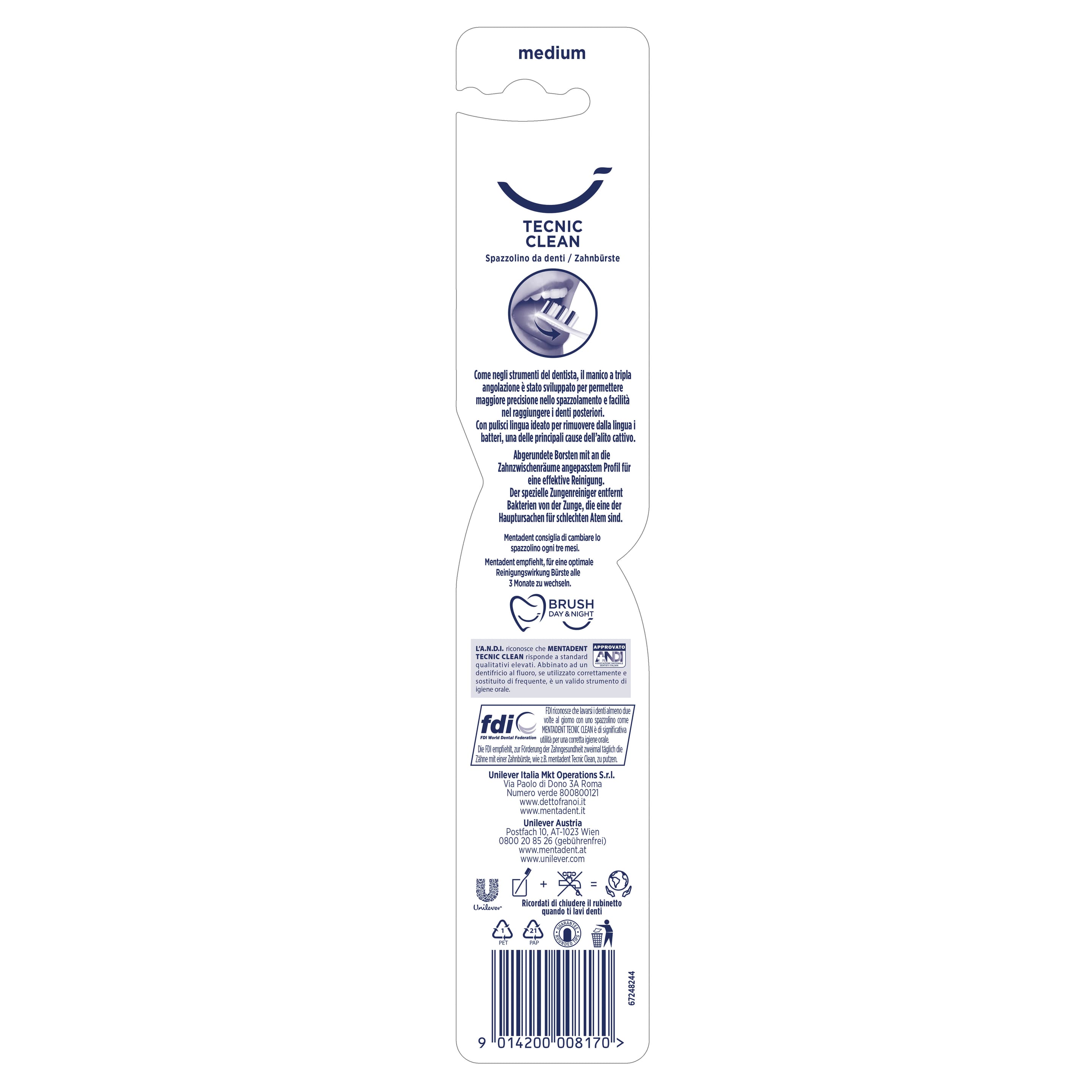 Bereits seit 1972 ist die Marke mentadent nicht mehr aus den Badezimmern Österreichs wegzudenken. Die traditionsreiche Marke zeichnet sich durch fortschrittliche Zahnpflege für die ganze Familie aus. So bietet mentadent für jedes Zahnpflegebedürfnis die richtige Lösung: Egal ob weißere Zähne, innovative Handzahnbürsten, effektive Zahnpflege für die Kleinsten oder die sanfte Pflege empfindlicher Zähne – im Sortiment von mentadent finden Sie genau das richtige Produkt. Unser Versprechen: Wir setzen uns weltweit für die Verbesserung der Mundgesundheit in Kooperation mit der „FDI World Dental Federation“ und lokalen Verbänden ein und bieten ausschließlich qualitative Produkte ohne Triclosan mentadent Zahnbürste Tecnic Clean Medium Für frischen Atem Labortests bestätigen, dass Zahnbürsten mit unterschiedlich hohen Borsten helfen, die Reinigung der schwer zugänglichen Zahnzwischenräume zu erleichtern. Darum besitzen die Borsten der mentadent Tecnic Clean ein speziell an die Zahnzwischenräume angepasstes Profil. Die mentadent Tecnic Clean besitzt den bewährten 3-Fach-Knick, der Zahnarztinstrumenten nachempfunden ist. So erreicht die Zahnbürste auch die hinteren Zähne für eine gründliche Plaqueentfernung. Der spezielle Zungenreiniger auf der Rückseite des Bürstenkopfes sorgt für eine effektive Entfernung von Bakterien, die sich auf der Zunge tummeln, eine der Hauptursachen für schlechten Atem. Die FDI empfiehlt, zur Förderung der Zahngesundheit zweimal täglich die Zähne mit einer Zahnbürste, wie z.B. mentadent Tecnic Clean, zu putzen.