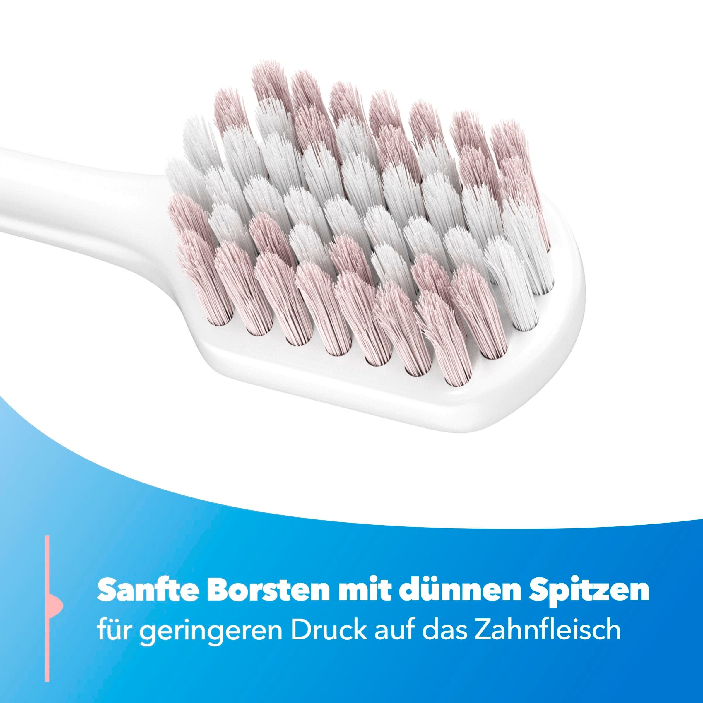 Die besondere Anordnung der Borsten sorgt für eine effektive Reinigung der Zahnoberflächen. Dank des weichen Bürstenkopfes wird das Zahnfleisch während des Zähneputzens geschont. Die Zahnbürste liegt gut in der Hand und ermöglicht eine kontrollierte Führung für ein sauberes Gefühl im gesamten Mundraum.