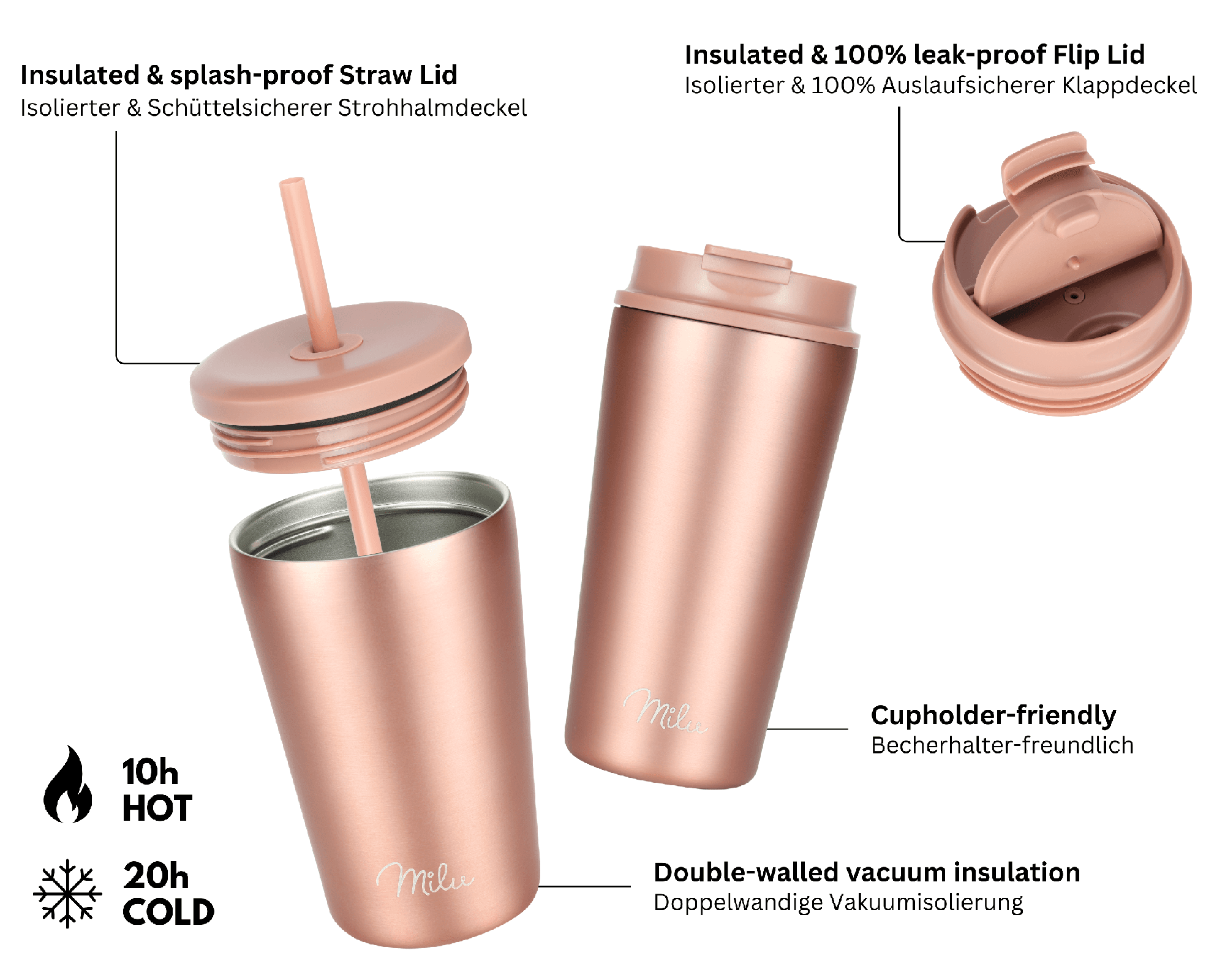 • Dank des Flip Flop-Deckels mit nur einer Hand zu öffnen. Der 2. Deckel mit Trinkhalm um die Hände frei zu haben
