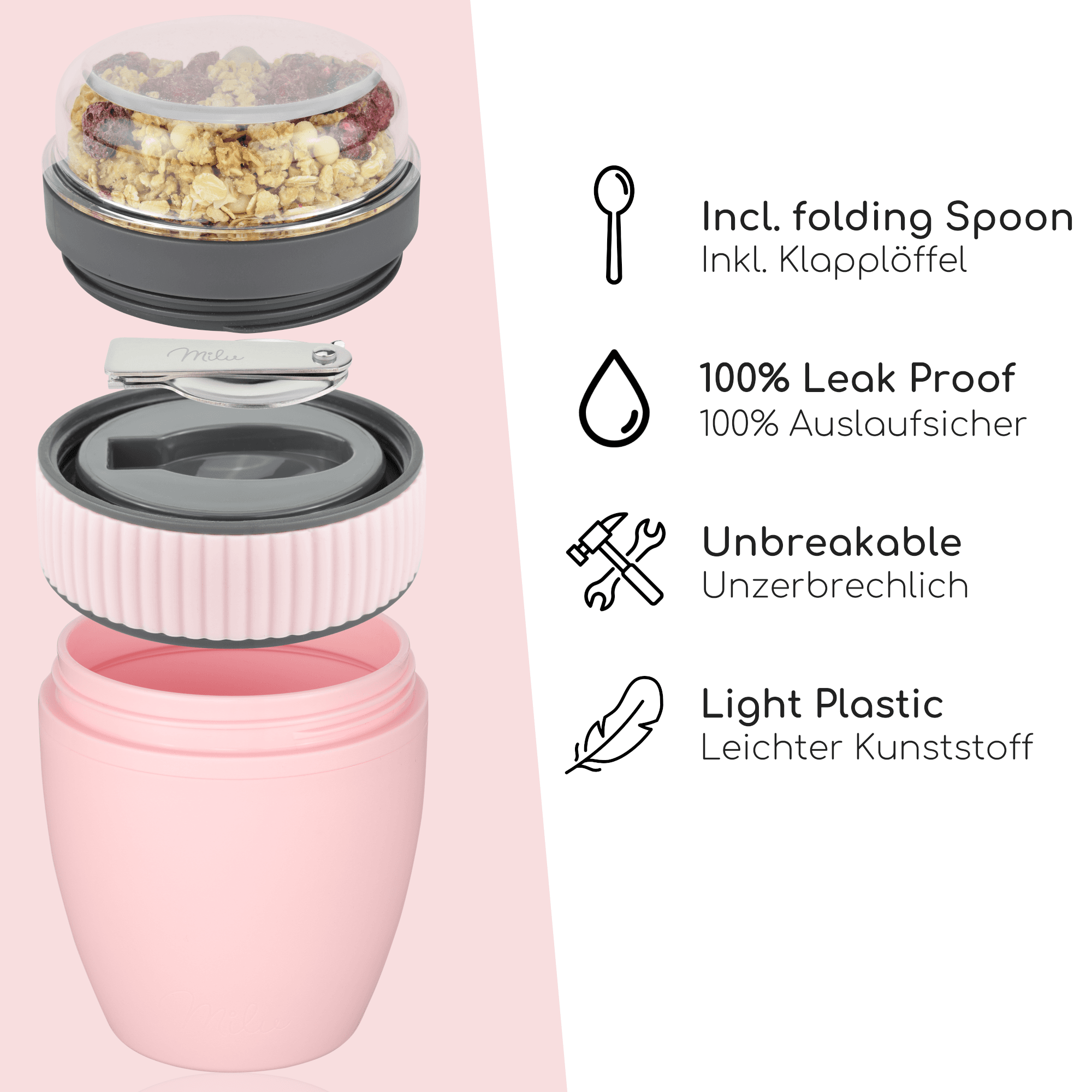 • 100% DICHT - Der Milu Müslibecher To Go ist dank des smarten Verschlusses absolut schütt- und auslaufsicher. Der Müsli-becher besteht aus geschmacksneutralem Kunststoff, dies sorgt für puren Genuss.