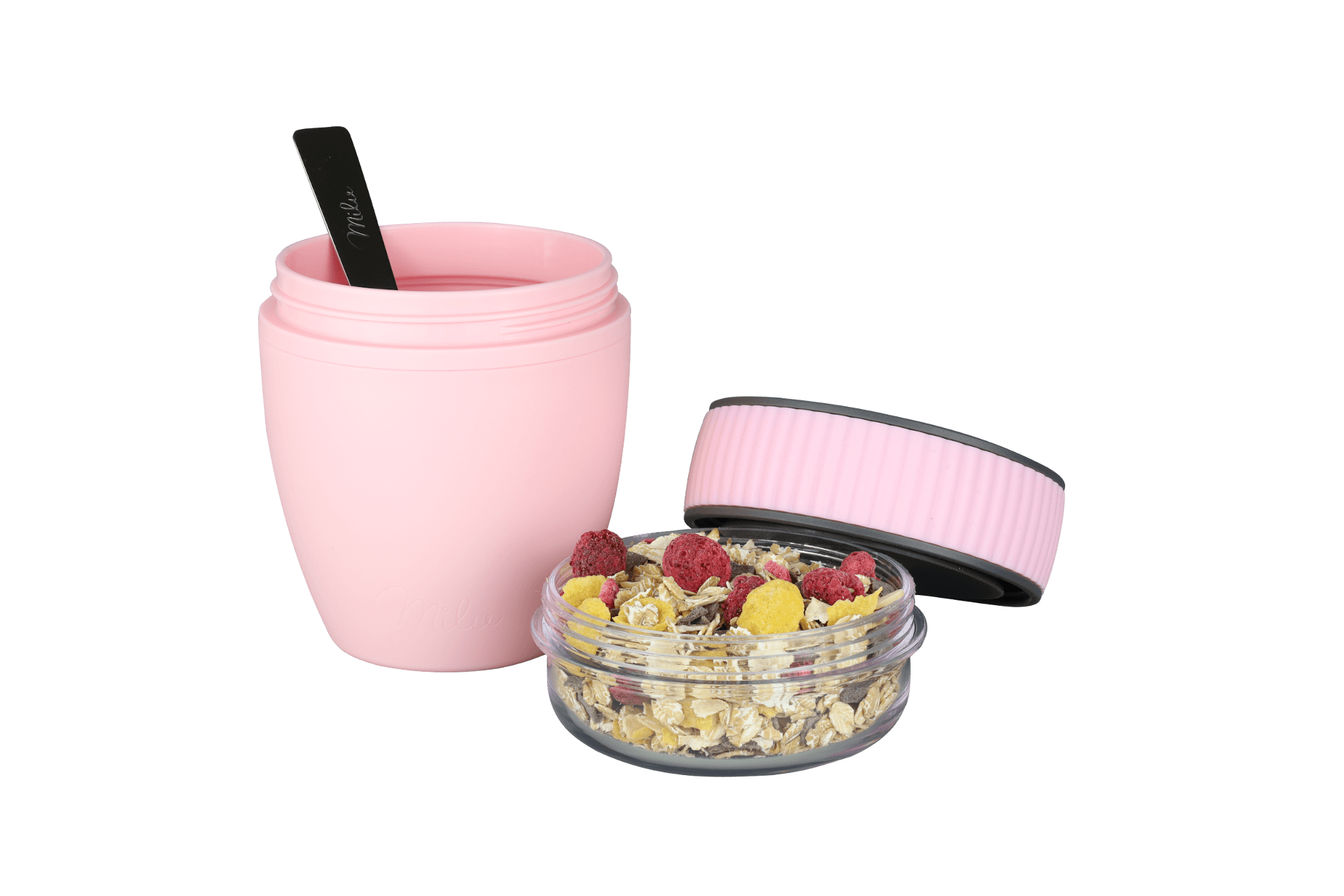 • LIEFERUMFANG - 1x Milu Müslibecher To Go 400 ml, 1x Behälter-Aufsatz 200 ml, 1x faltbaren Edelstahl-Löffel