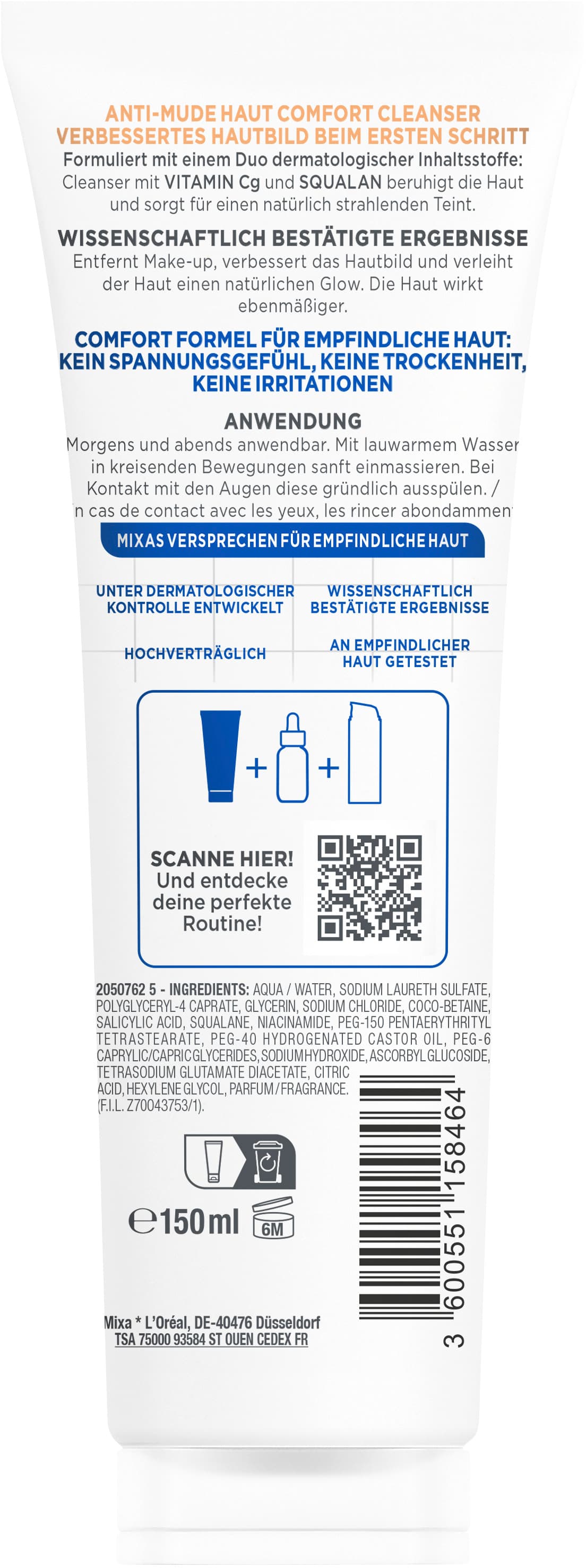 Der Anti-Müde Haut Comfort Cleanser von Mixa ist eine sanfte Reinigung für ungleichmäßige, müde Haut. Seine hochverträgliche Formel mit Squalan und Vitamin C befreit die Gesichtshaut schonend von Schmutz, Make-up und überschüssigem Talg und zeichnet sich darüber hinaus durch eine exfolierende Wirkung aus. So entfernt er schonend Hautschüppchen und unterstützt damit ein verbessertes Hautbild sowie einen ebenmäßigeren und strahlenden Teint. Die sanfte Formulierung des Reinigungsgels wirkt zugleich beruhigend und erhält die natürliche Feuchtigkeit der Haut, sodass weder Spannungsgefühle noch Trockenheit oder Irritationen entstehen.