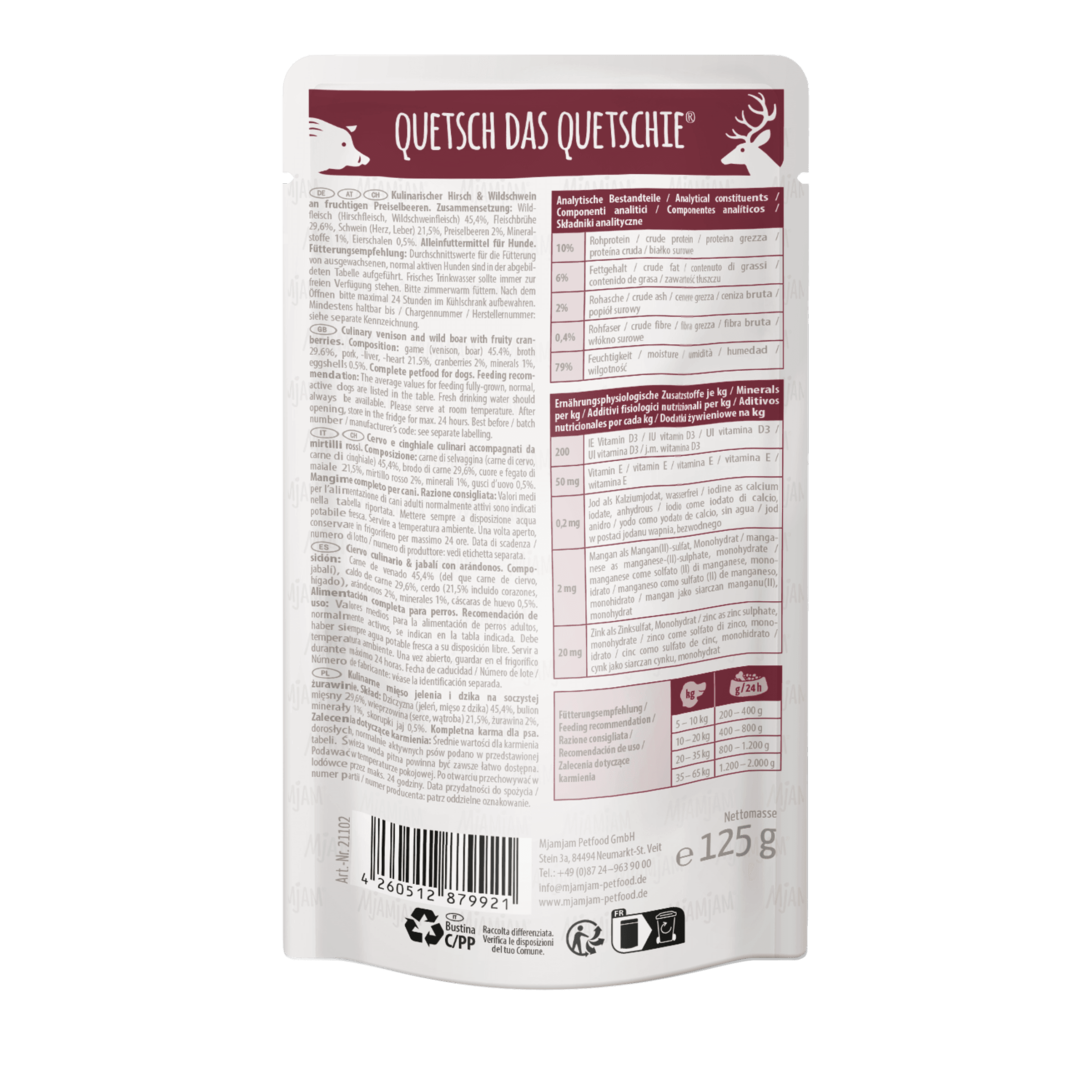 MjAMjAM Hundenassfutter Quetschie kulinarischer Hirsch & Wildschwein an fruchtigen Preiselbeeren