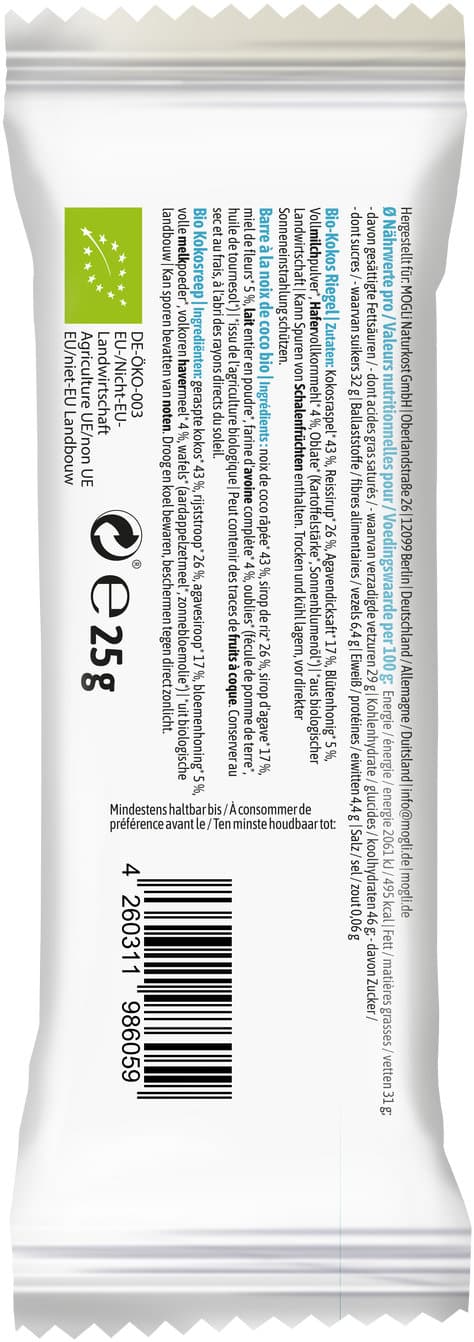 | Zutaten | Kokosraspel* 43%, Reissirup* 26%, Agavendicksaft* 17%, Blütenhonig* 5%, VOLLMILCHPULVER*, |