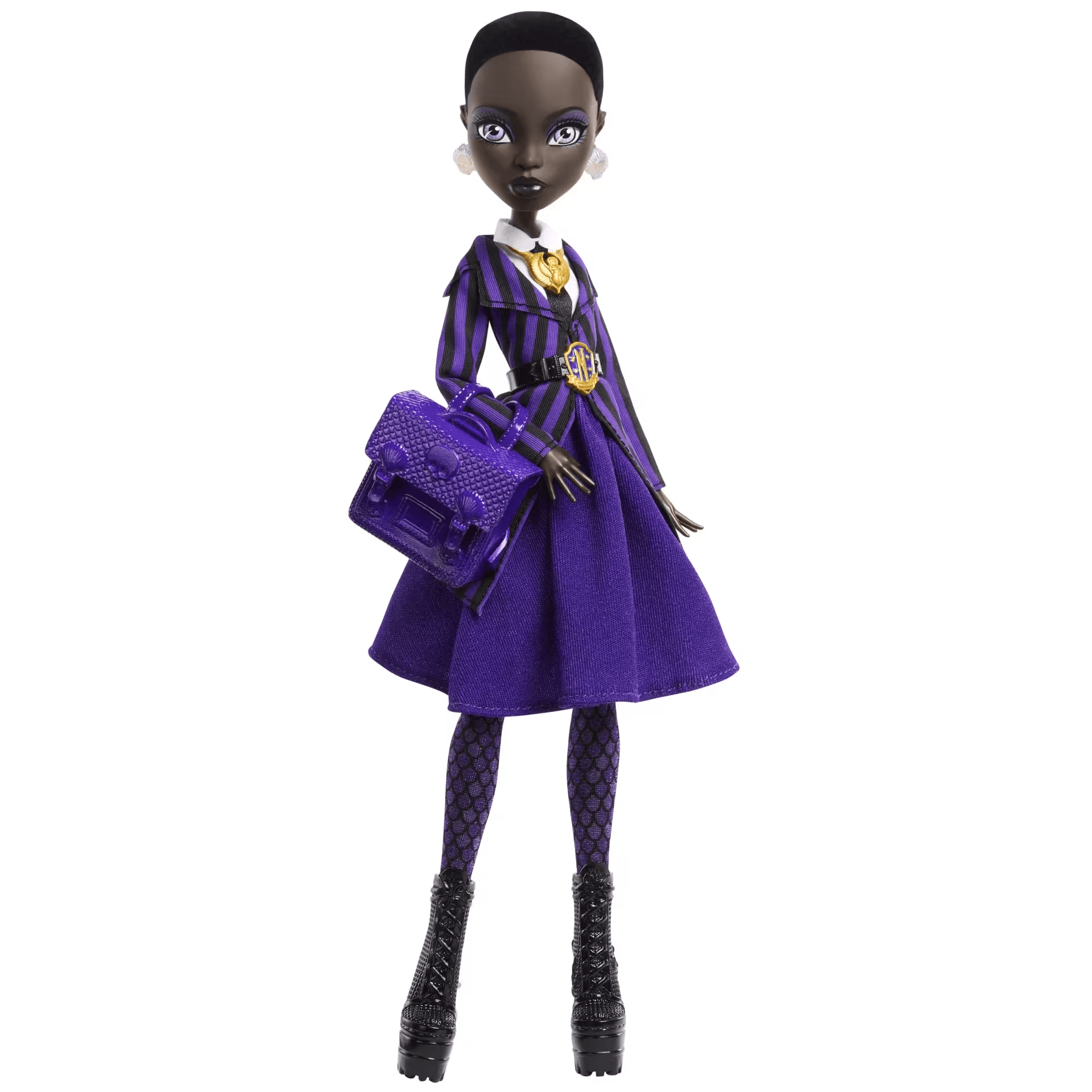 Tauche ein in die düstere Welt von Nevermore Academy mit der exklusiven Sammelpuppe Bianca Barclay aus der Monster High x Wednesday-Kollektion! Als charismatische Sirenen-Königin begeistert Bianca mit ihrem einzigartigen Stil und ihrer geheimnisvollen Aura. Die 10,5 Zoll große Puppe trägt eine detailreiche Schuluniform in Lila, verziert mit einem Schulwappen-Gürtel, schimmernden Muschel-Ohrringen, einem goldenen Sirenen-Amulett und schuppigen Strumpfhosen. Ihr Look wird durch Plateau-Stiefel und einen stylischen Rucksack abgerundet – perfekt für Fans der Serie und Sammler. Die Verpackung zeigt die Kulisse der Nevermore Academy und eignet sich ideal zur Präsentation. Mit 11 Bewegungspunkten, einem Puppenständer und einem Zertifikat der Echtheit ist Bianca ein echtes Highlight für jede Sammlung.